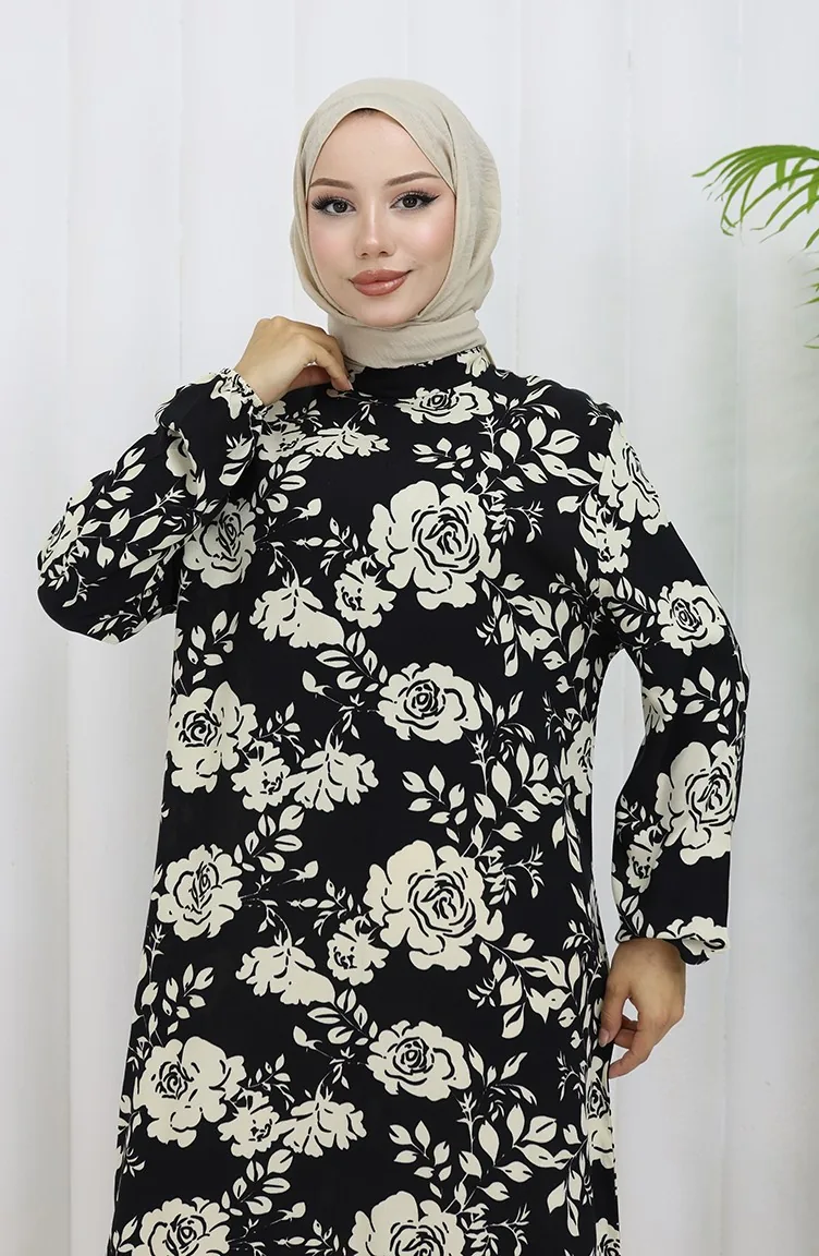 Siyah renktedir. Viskon kumaş. Desenli kumaş. Astarsız. Lastik kollu. Sıfır yaka detayı ile rahat kullanıma sahiptir. 4 Mevsim tercih edebilirsiniz. Rahat. Büyük beden seçeneği mevcuttur.