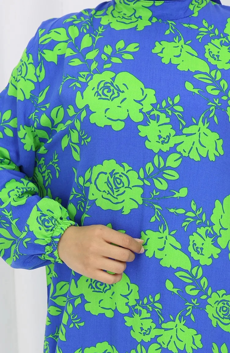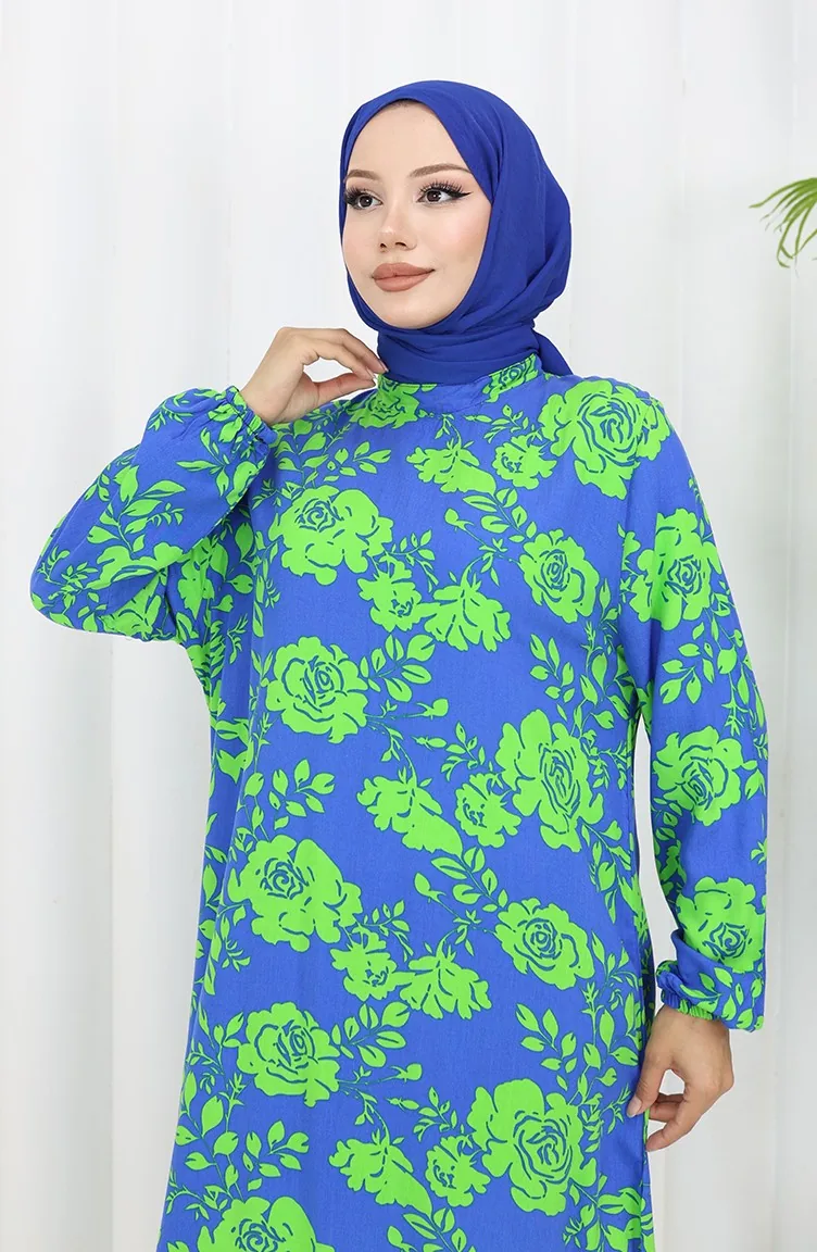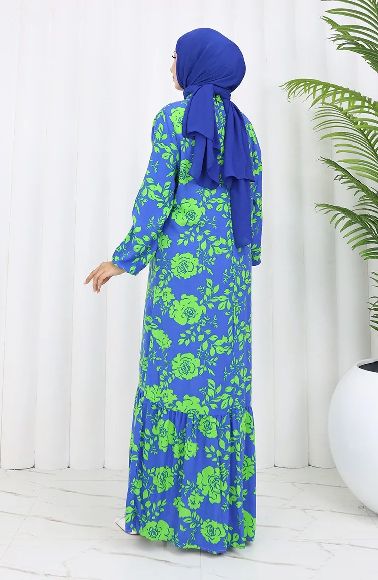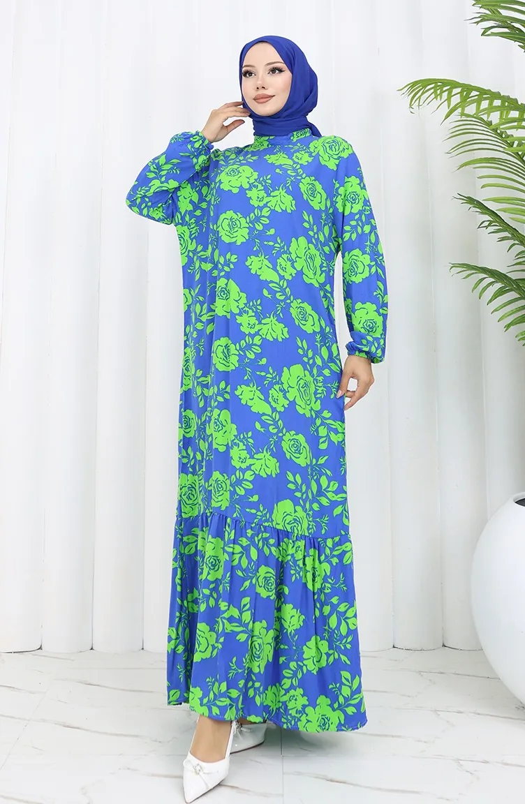 Viskon Kumaş Kolu Lastikli Desenli Elbise 2037-02 Saks