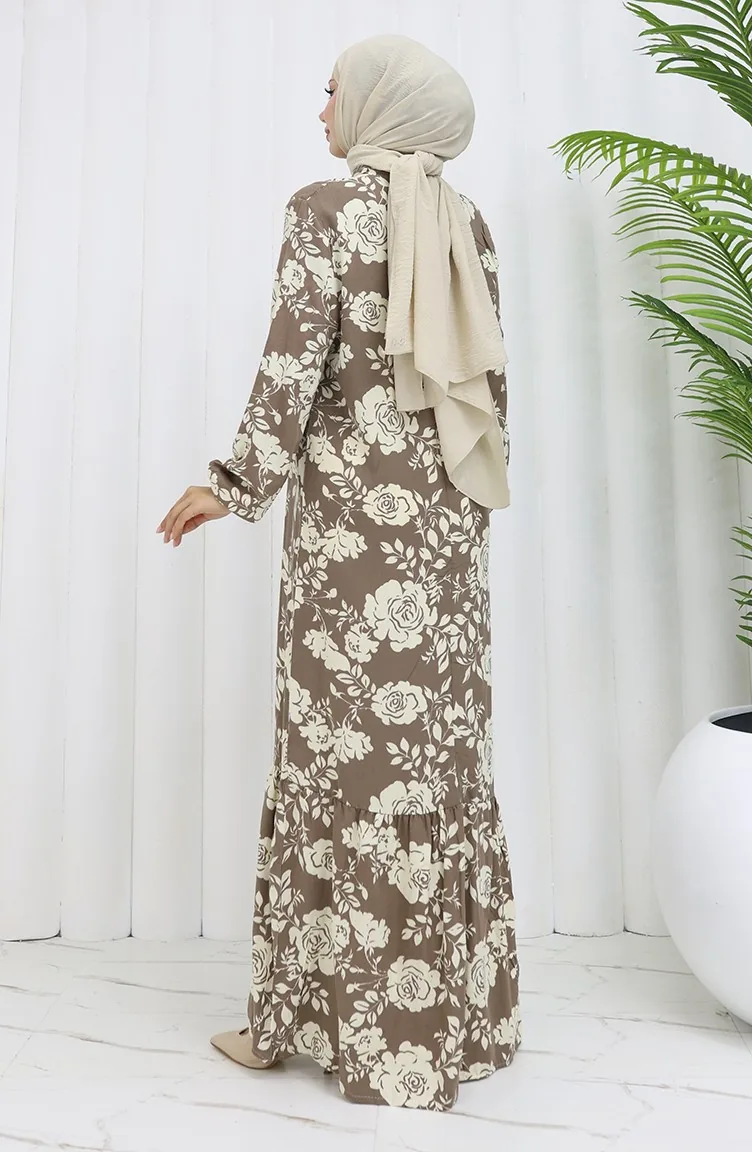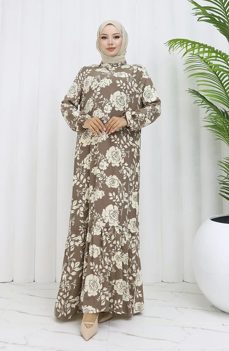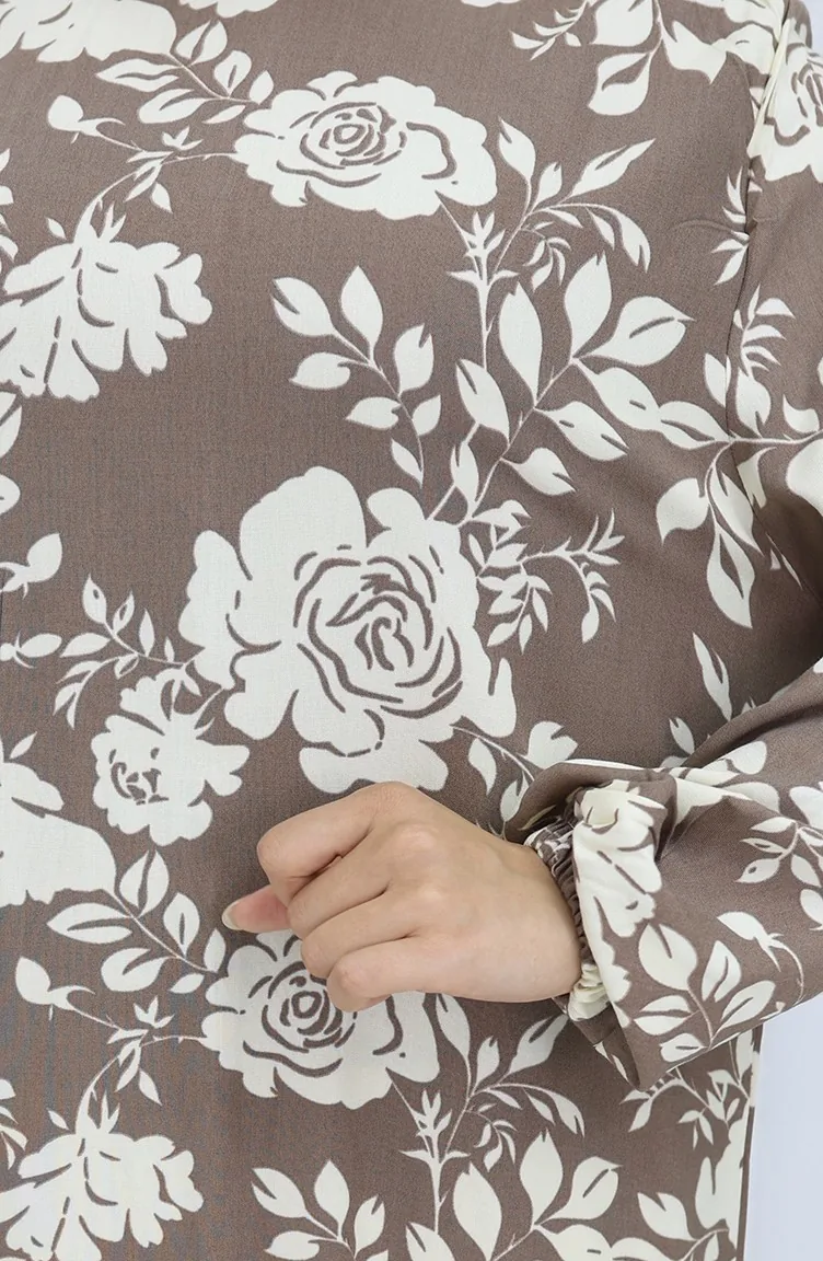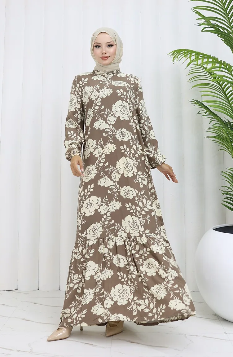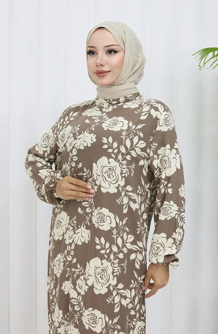 Viskon Kumaş Kolu Lastikli Desenli Elbise 2037-03 Vizon