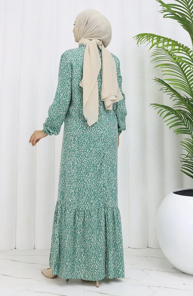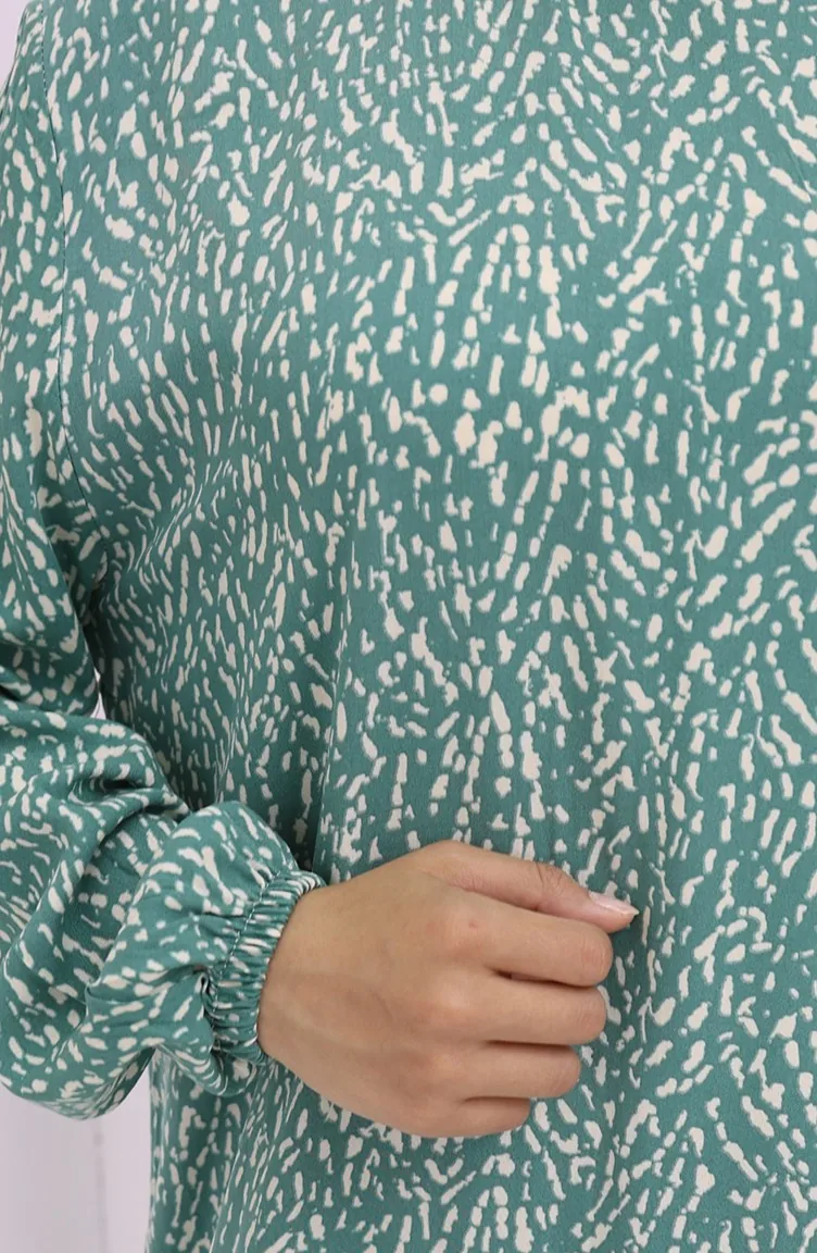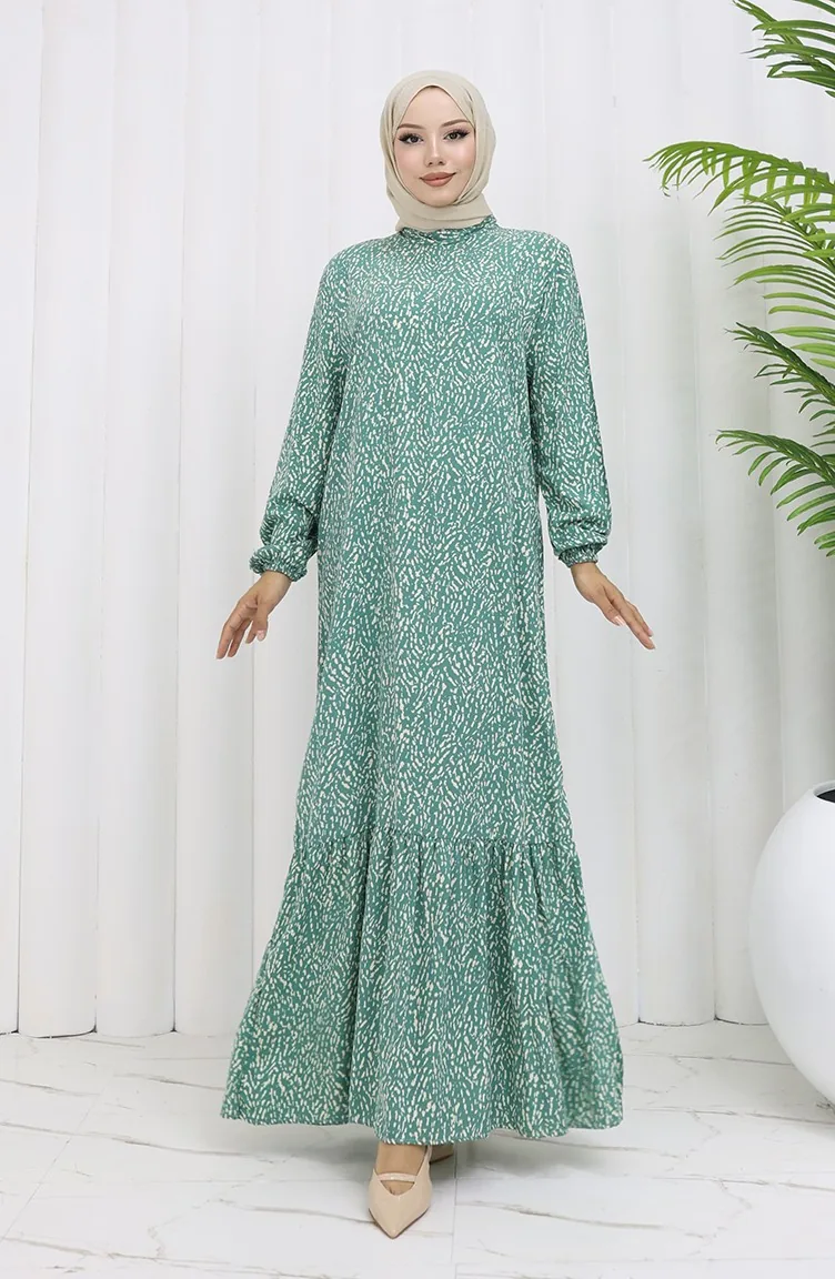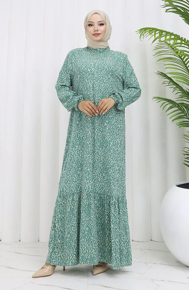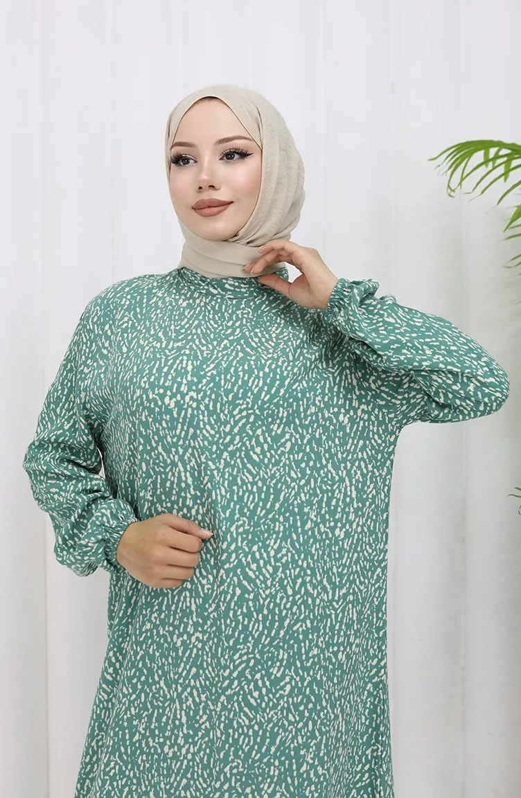 Viskon Kumaş Kolu Lastikli Desenli Elbise 2038-05 Çağla Yeşili