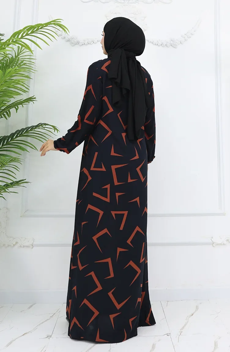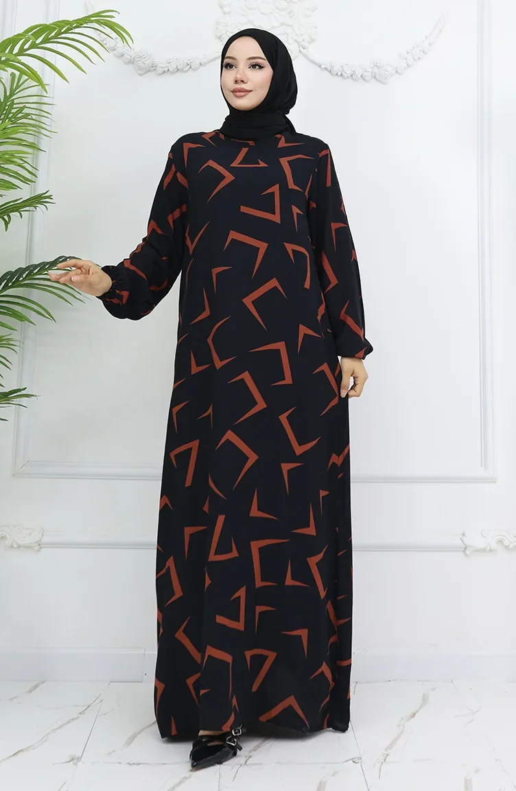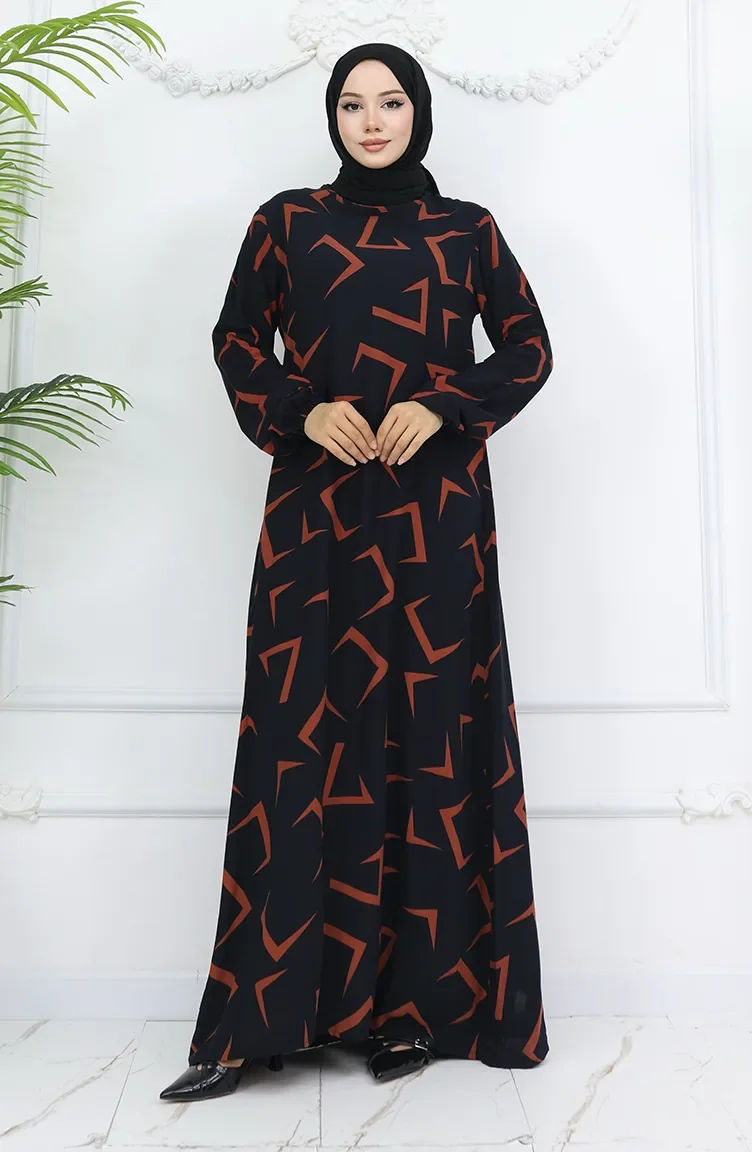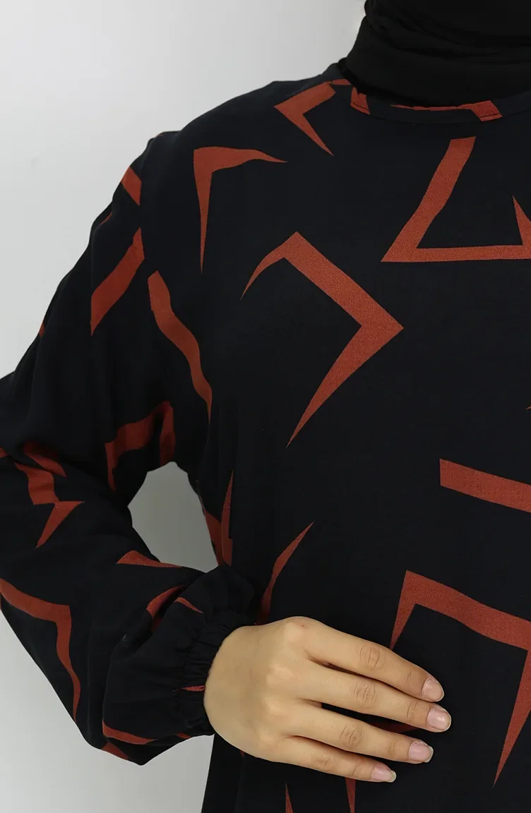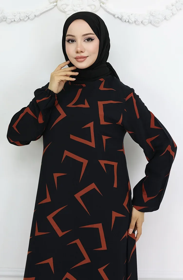 Viskon Kumaş Kolu Lastikli Elbise 0032-02 Siyah Kiremit