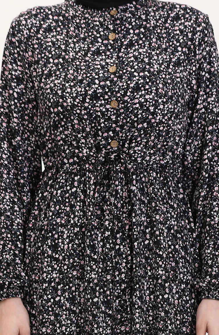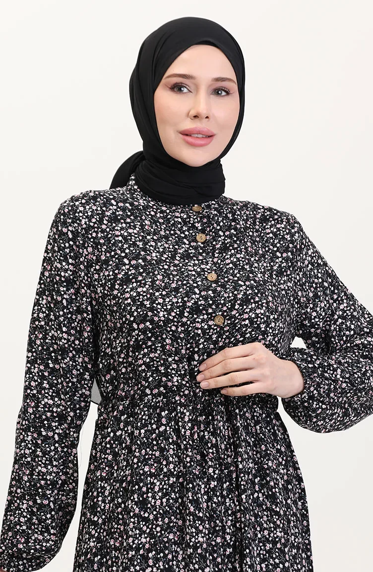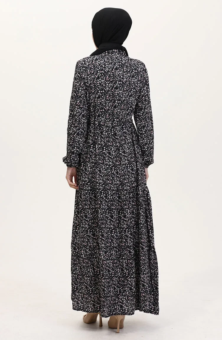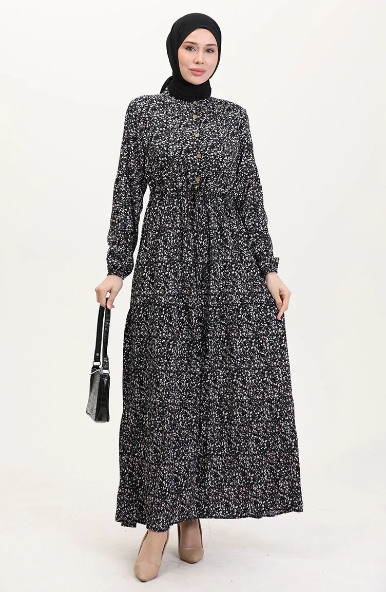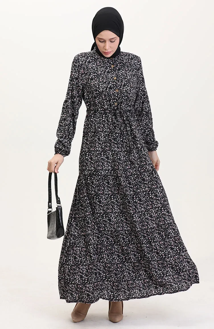 Viskon Kumaş Yarım Düğmeli Desenli Elbise 0037-02 Siyah