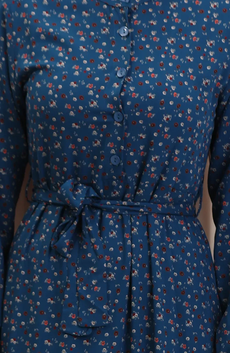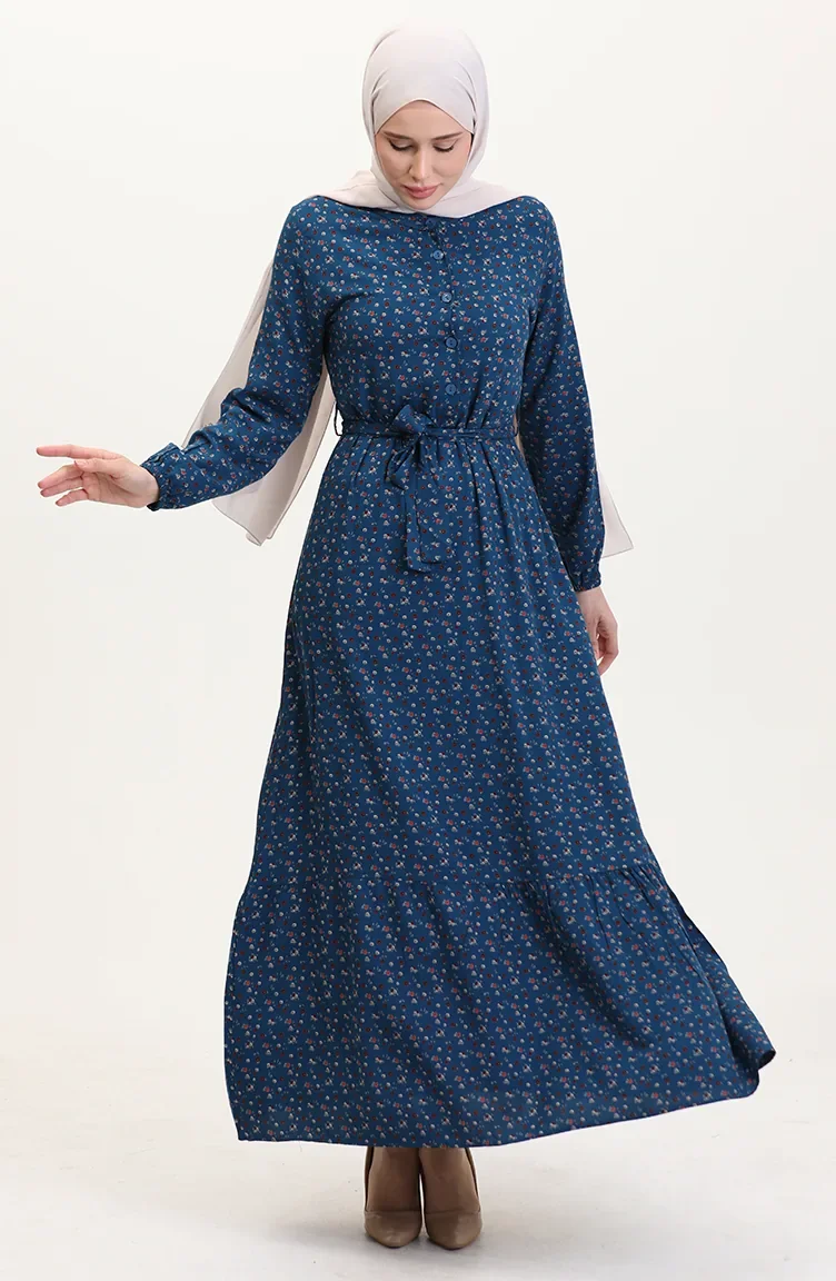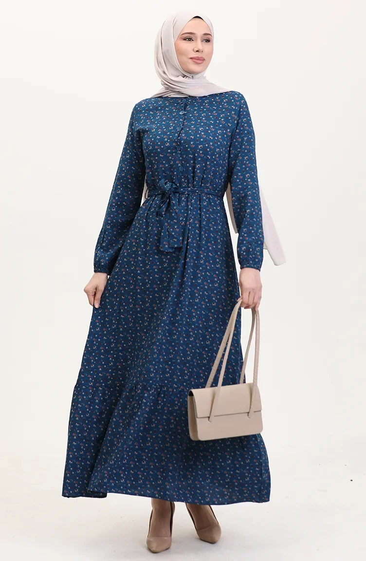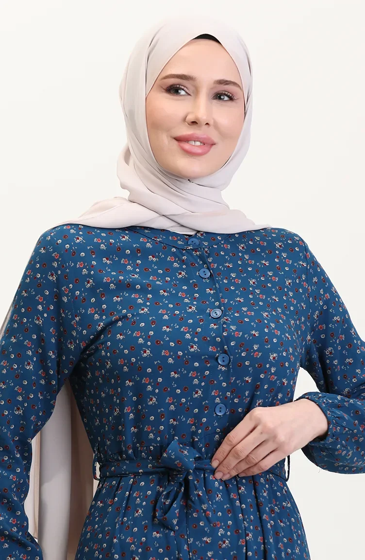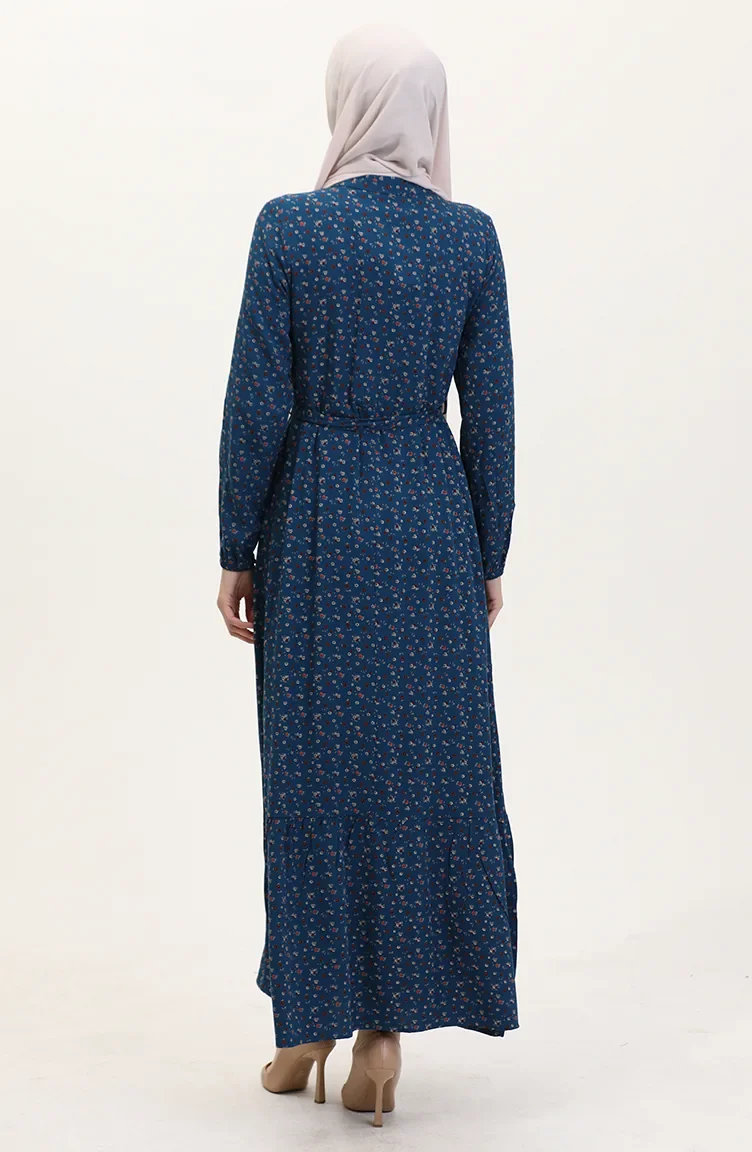Viskon Kumaş Yarım Düğmeli Desenli Elbise 4069-03 Petrol