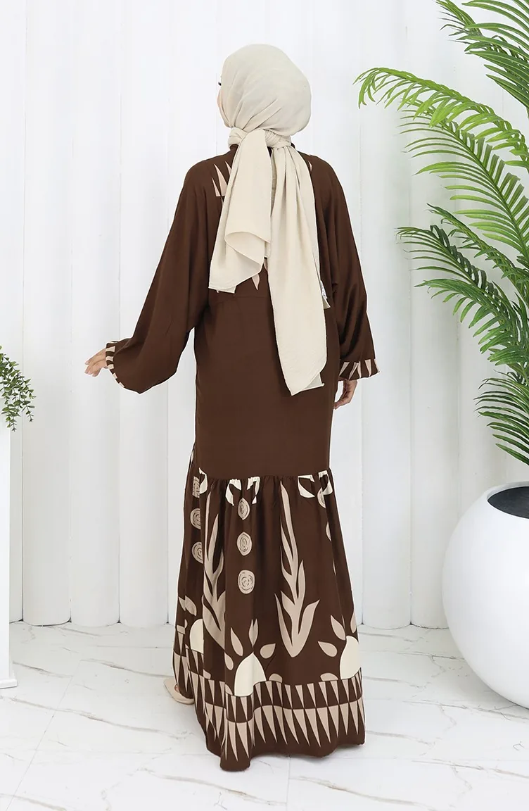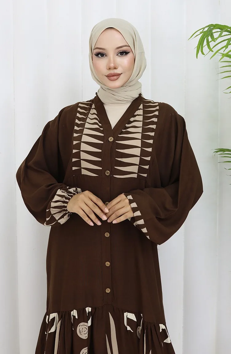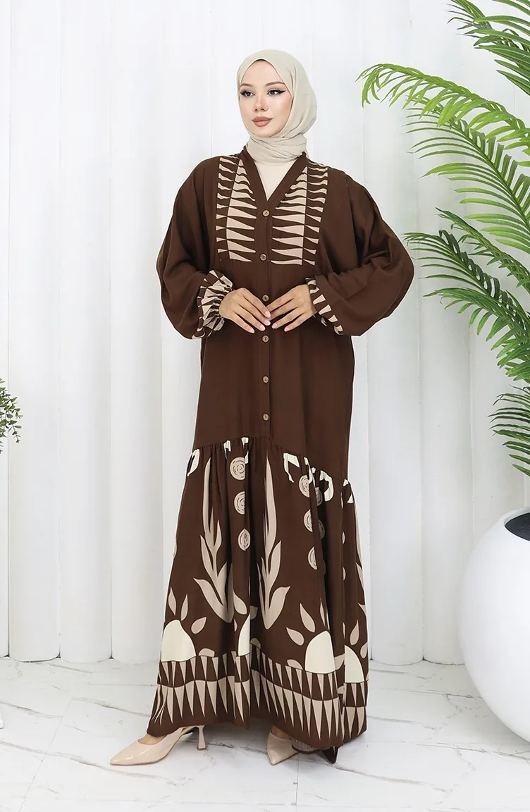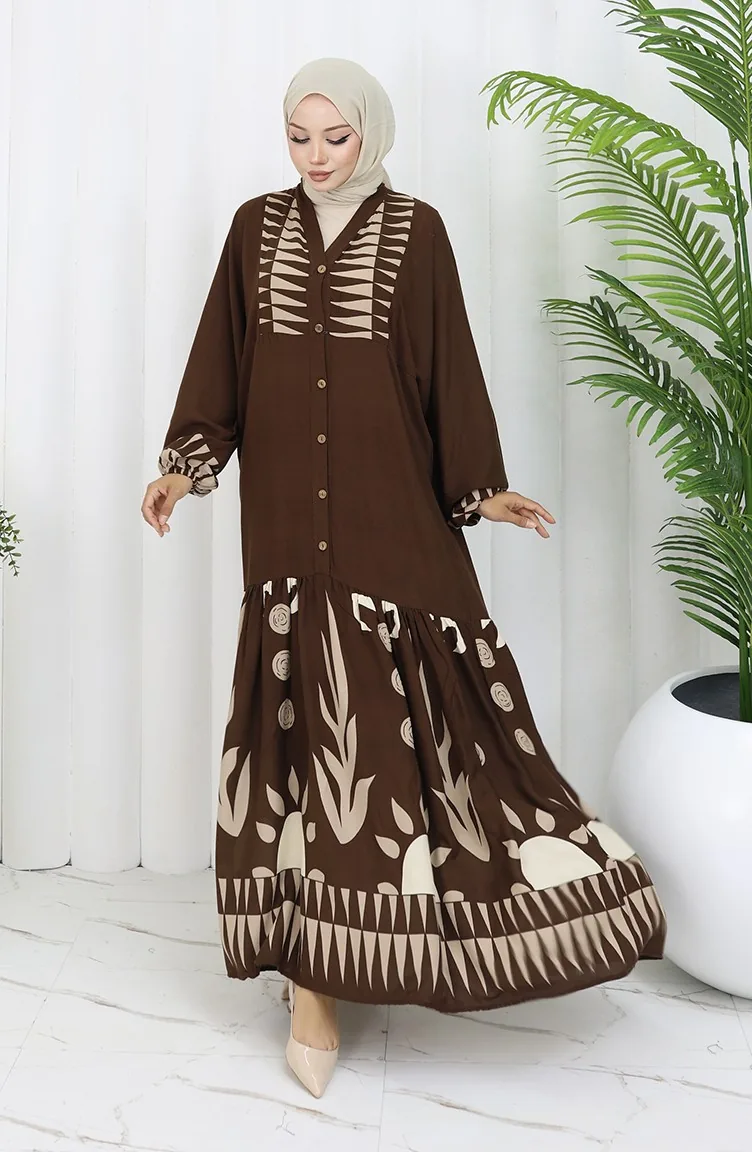 Viskon Kumaş Yarım Düğmeli Elbise 0075-03 Kahverengi