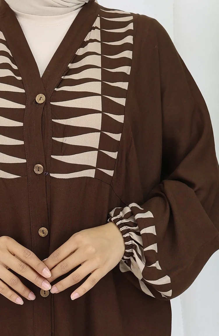 Kahverengi renktedir. Viskon kumaş. Desenli kumaş. Düğmeli. Lastik kollu. V yaka detayı ile içinize gömlek veya badi kullanabilirsiniz. 4 Mevsim tercih edebilirsiniz. Rahat. Büyük beden seçeneği mevcuttur.
