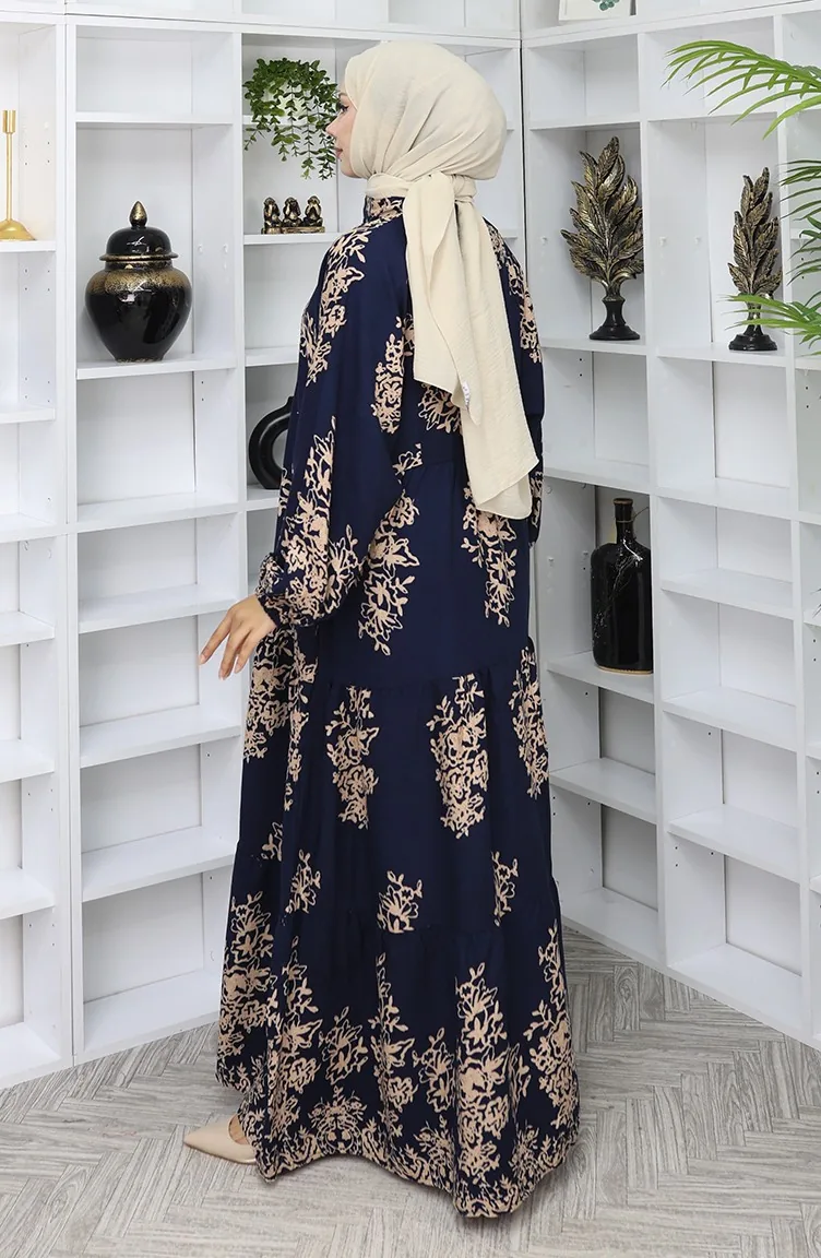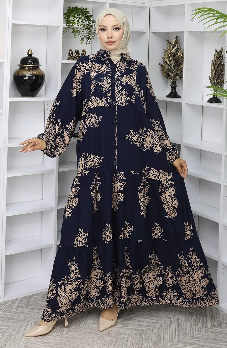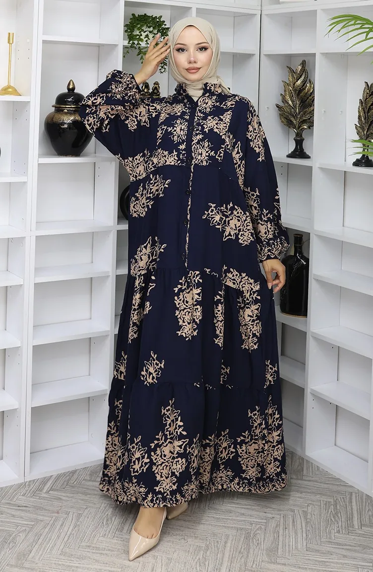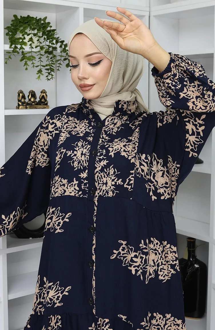 Viskon Kumaş Yarım Düğmeli Elbise 2044-01 Lacivert