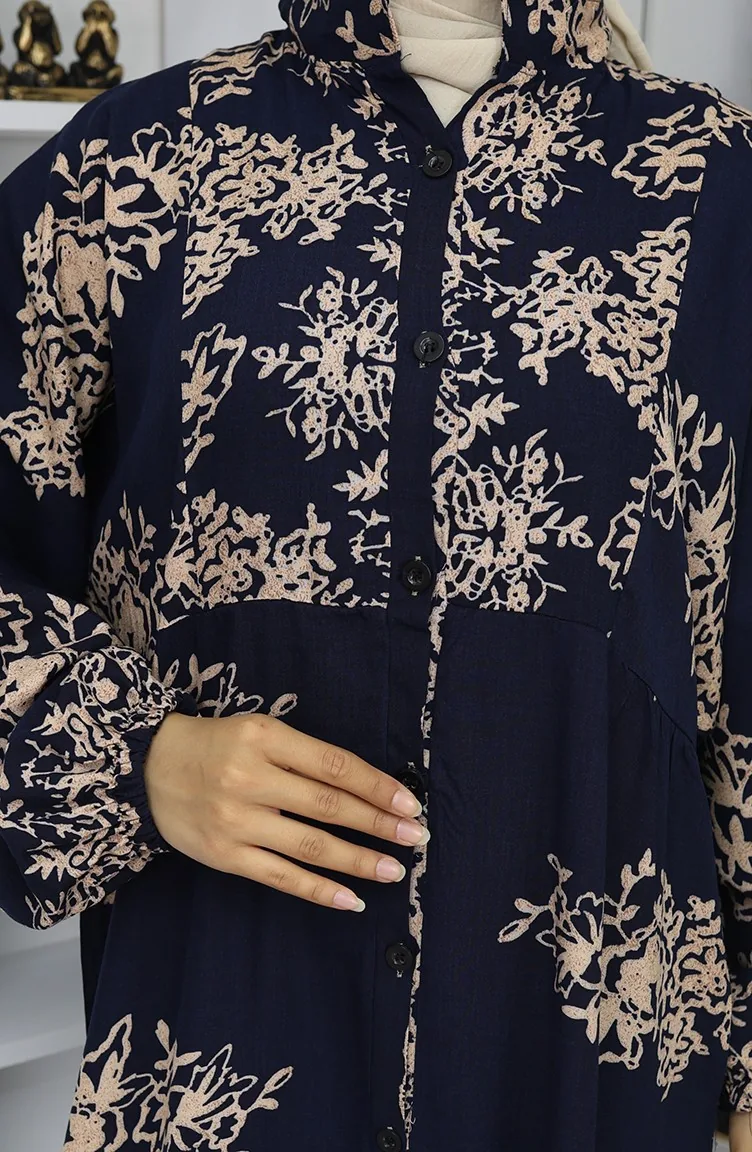 Lacivert renktedir. Viskon kumaş. Desenli kumaş. Düğmeli. Lastik kollu. Hakim yaka detayı ile kullanışlı modeldir. 4 Mevsim tercih edebilirsiniz. Rahat. Büyük beden seçeneği mevcuttur.