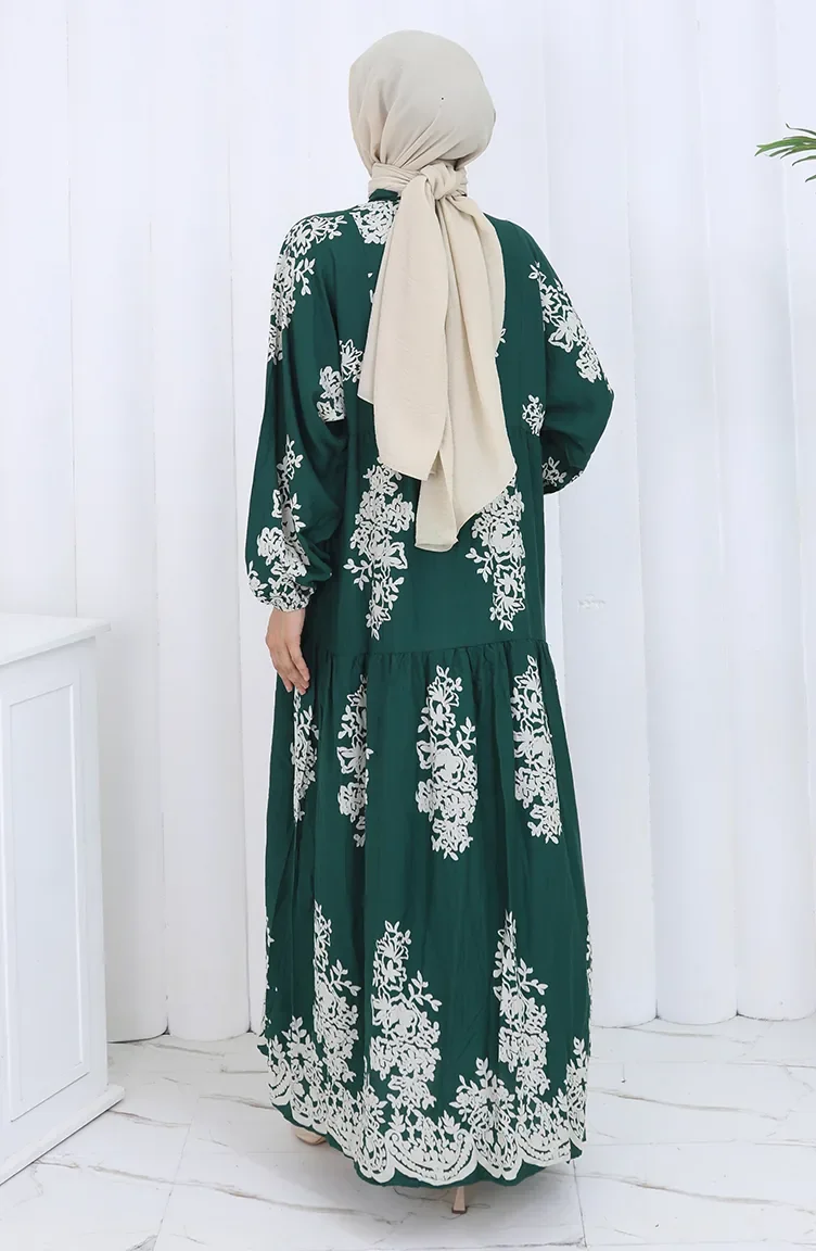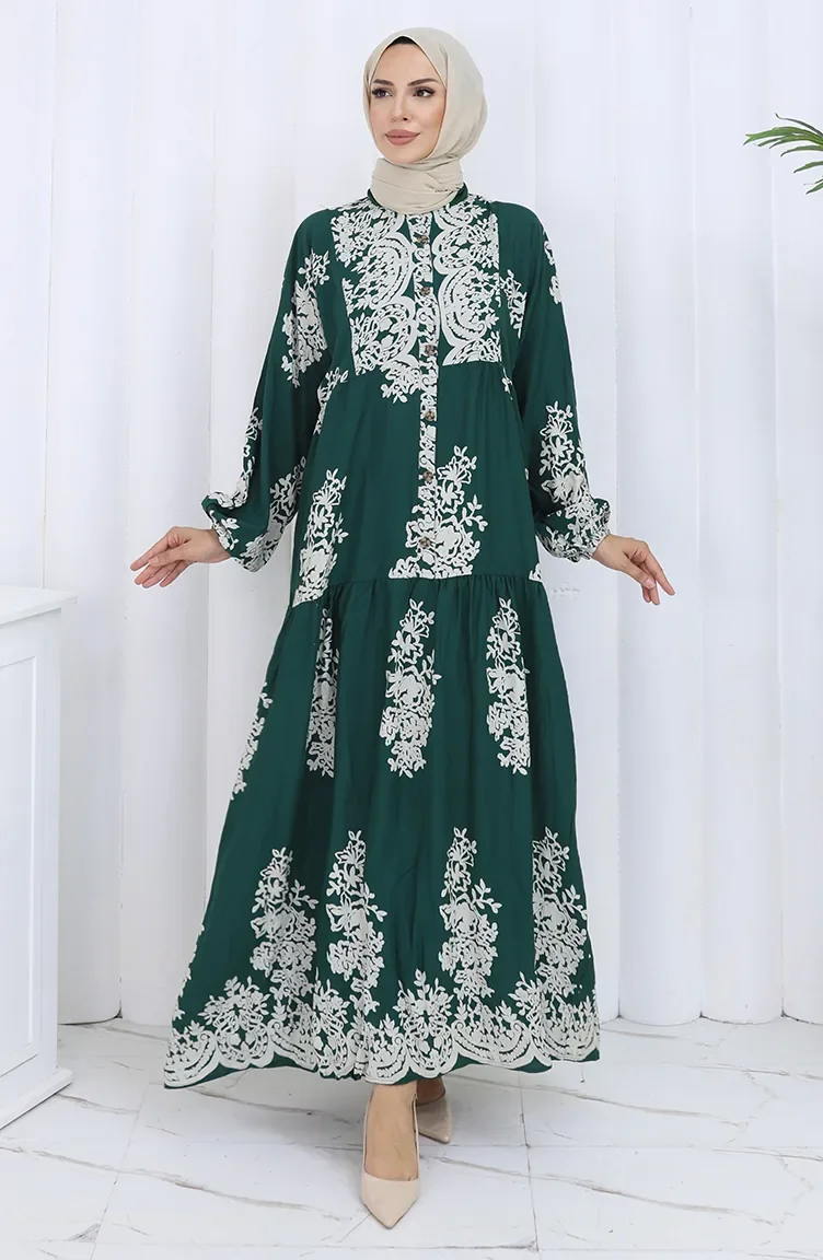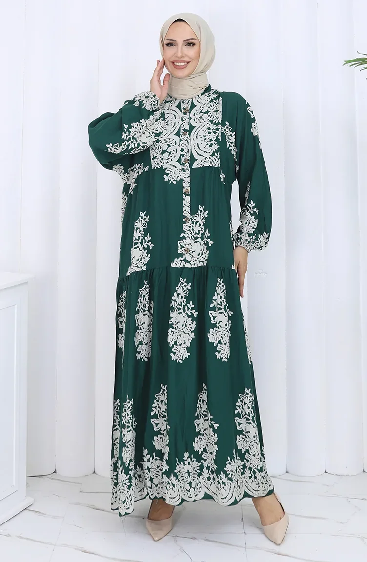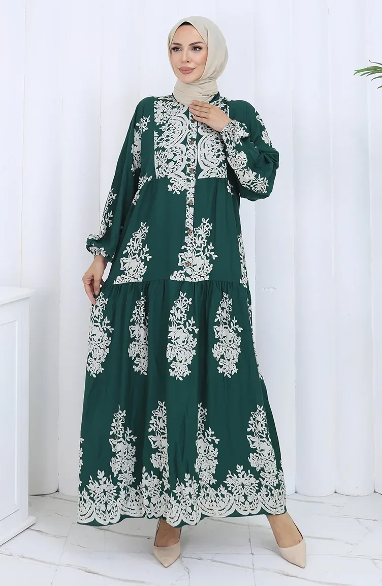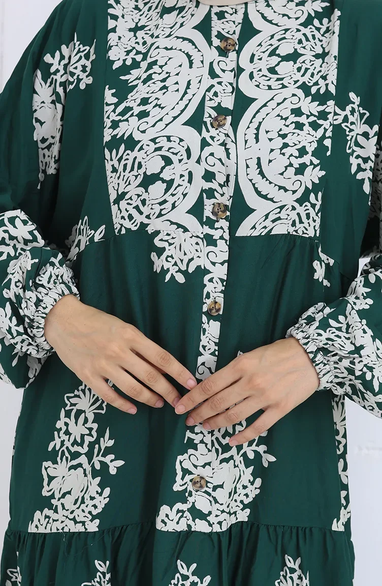 Viskon Kumaş Yarım Düğmeli Elbise 2117-05 Zümrüt Yeşili
