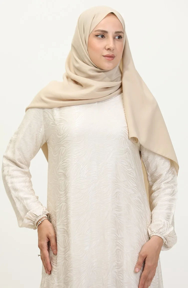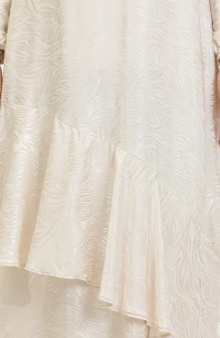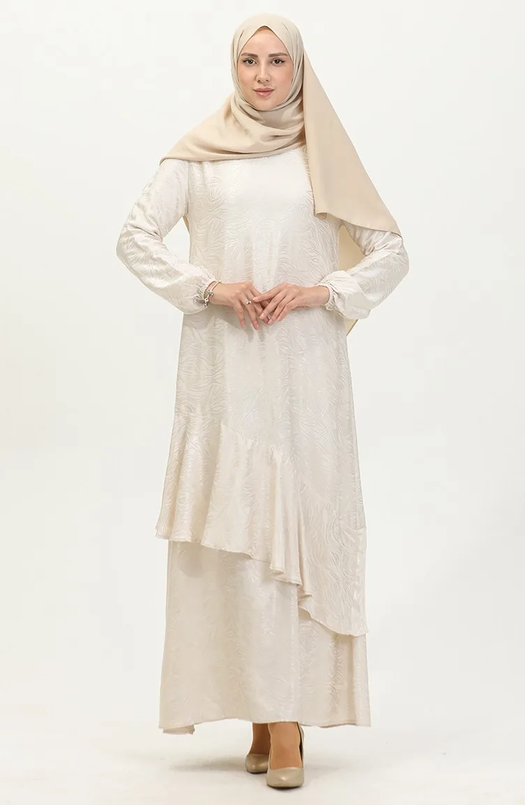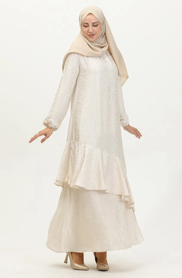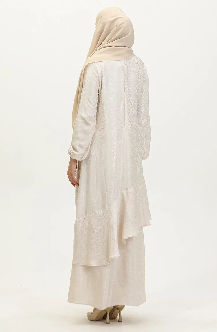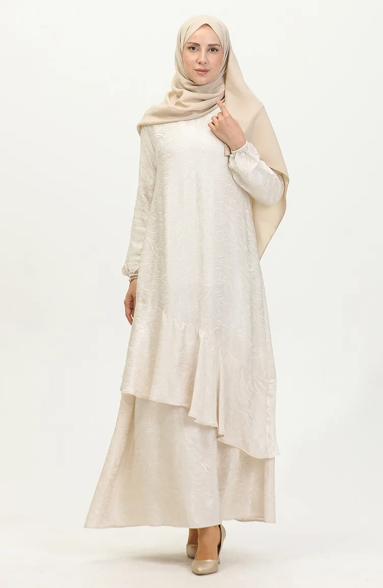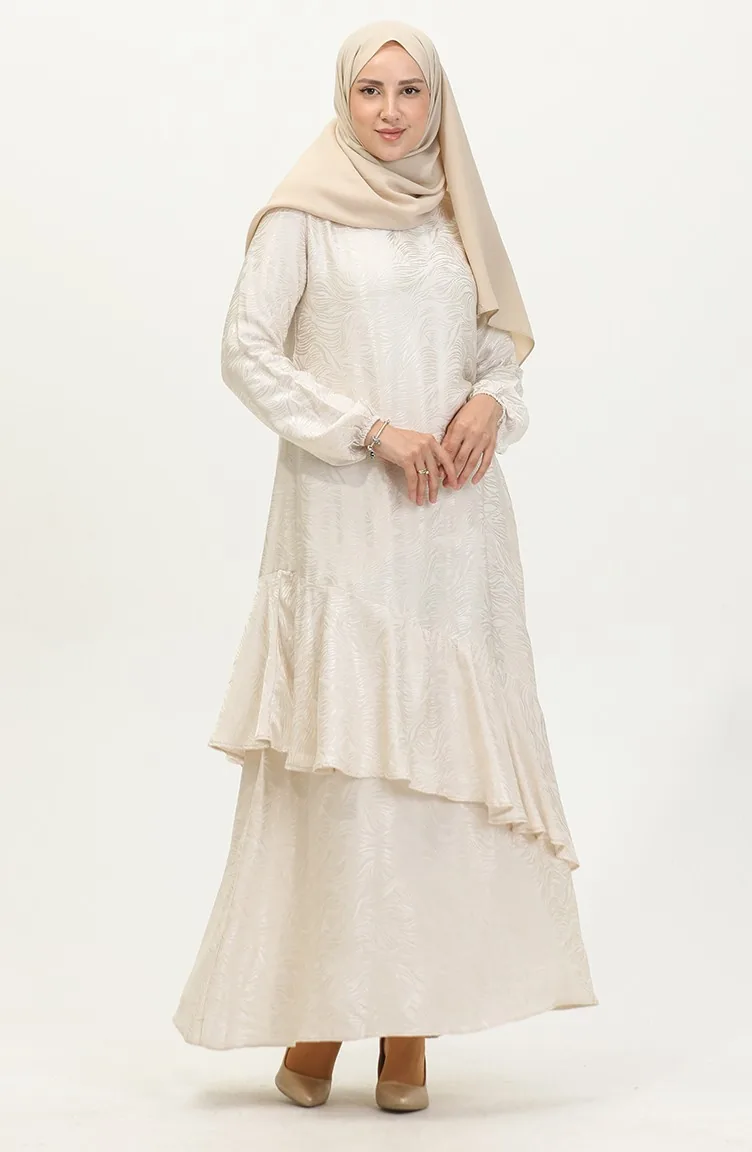 Volan Detaylı Jakarlı Elbise 81866-05 Ekru