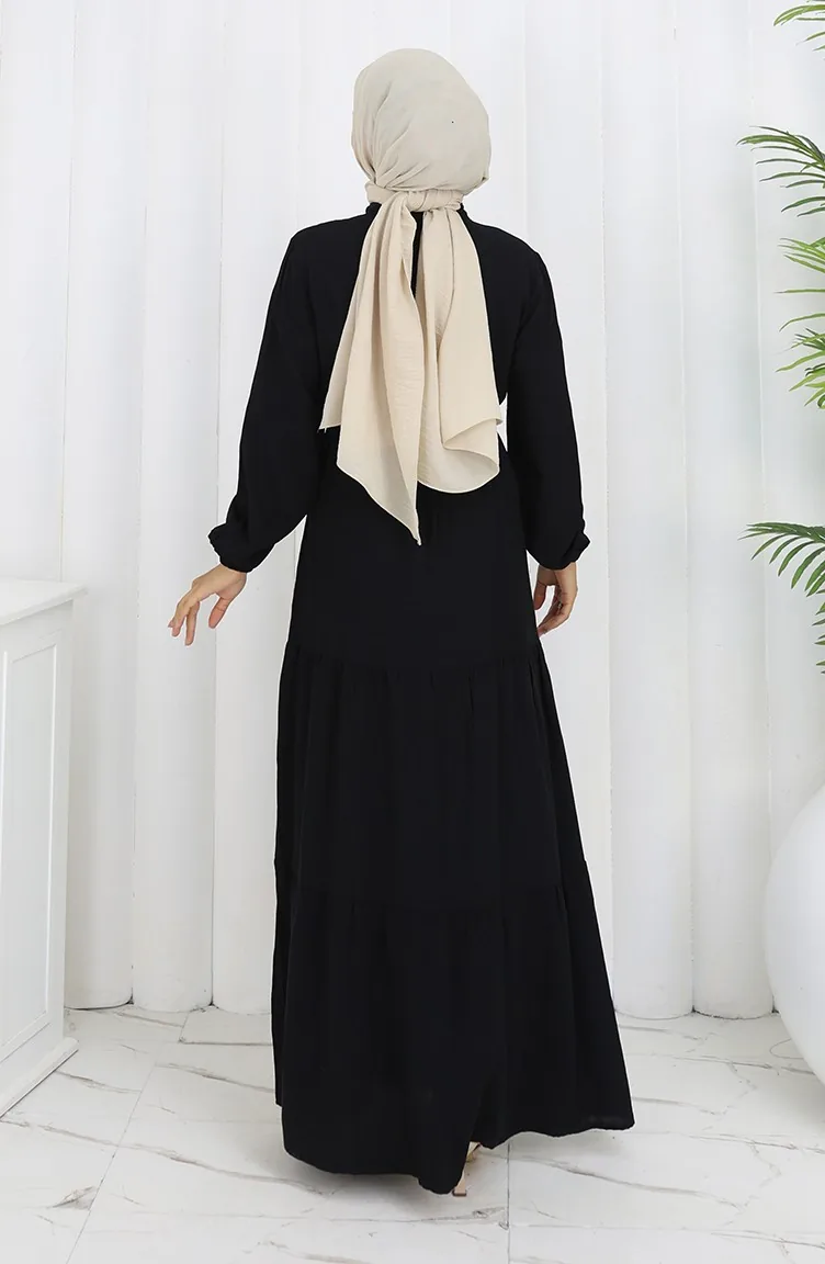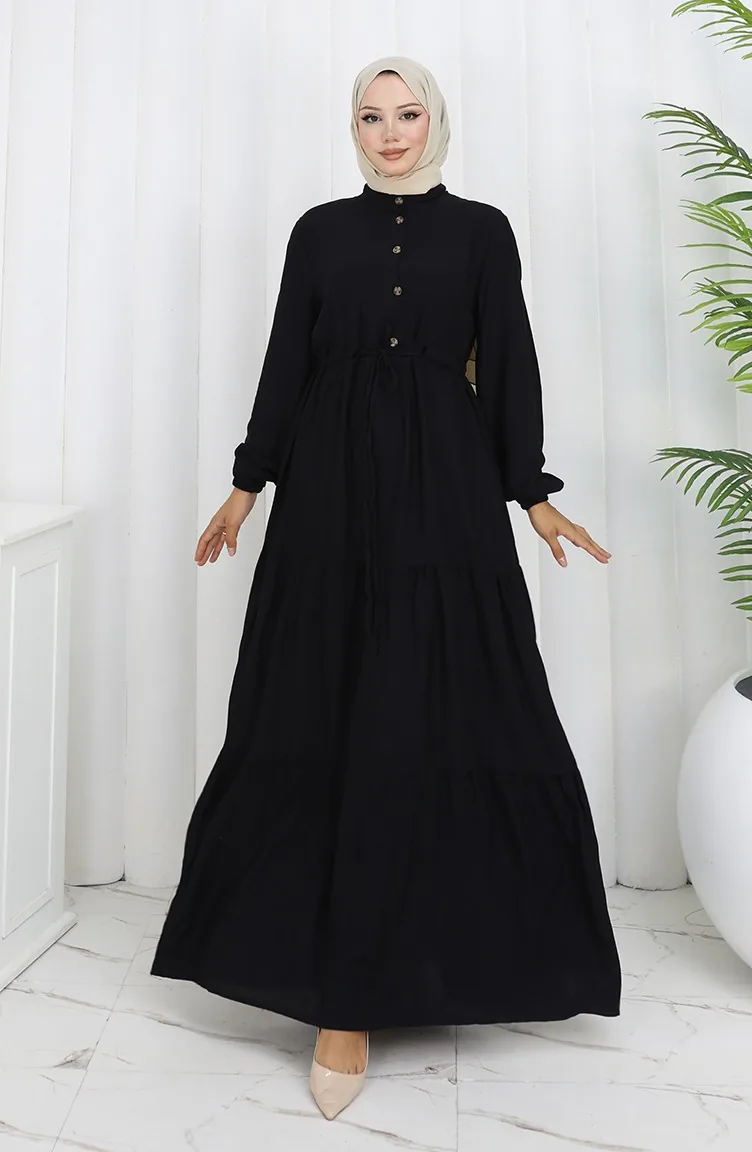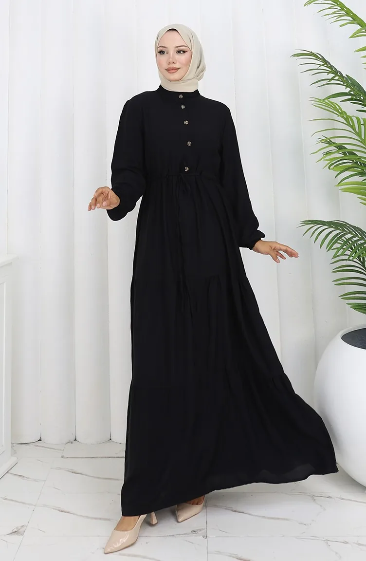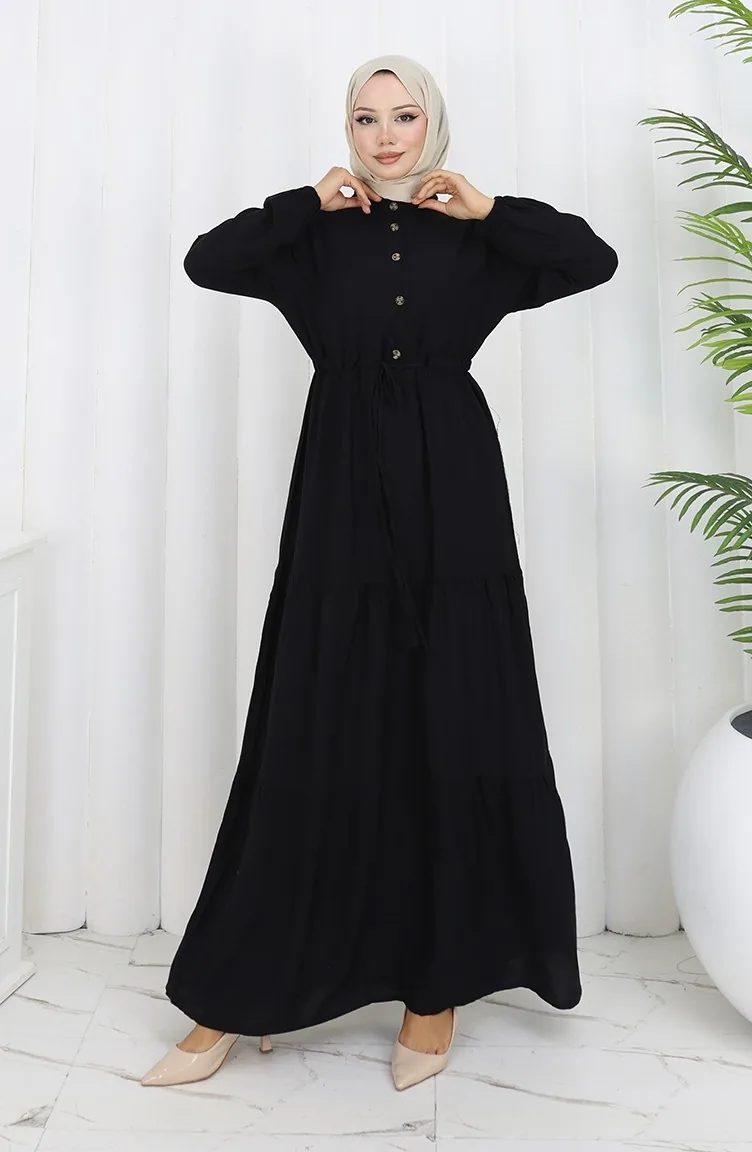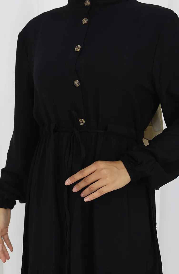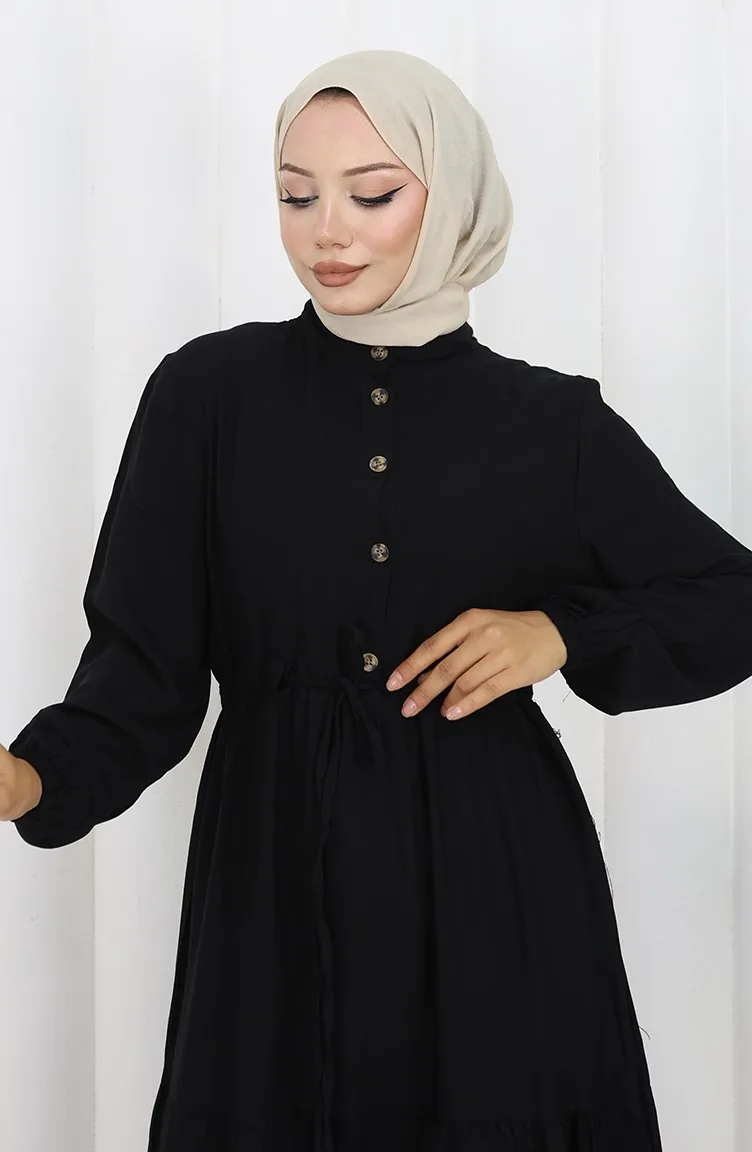 Yarım Düğmeli Beli Bağcıklı Elbise 2154-01 Siyah