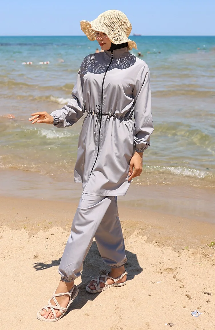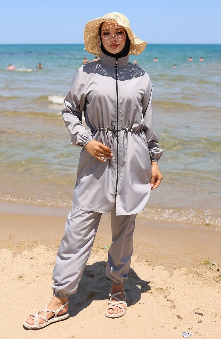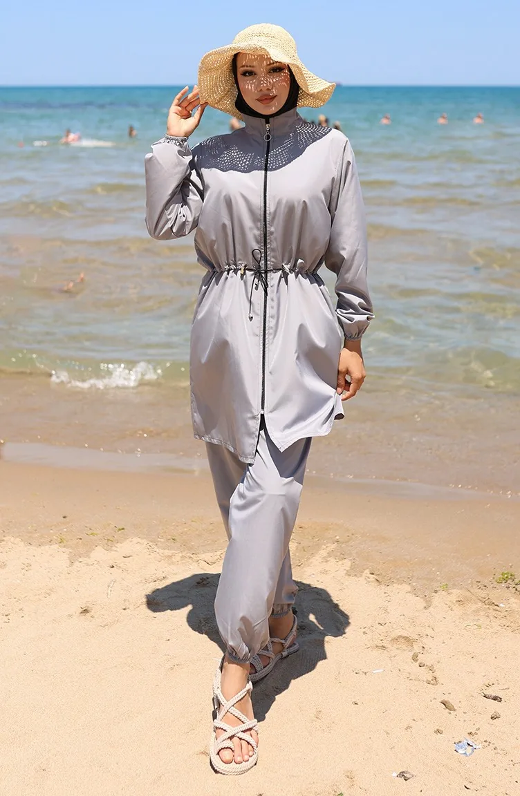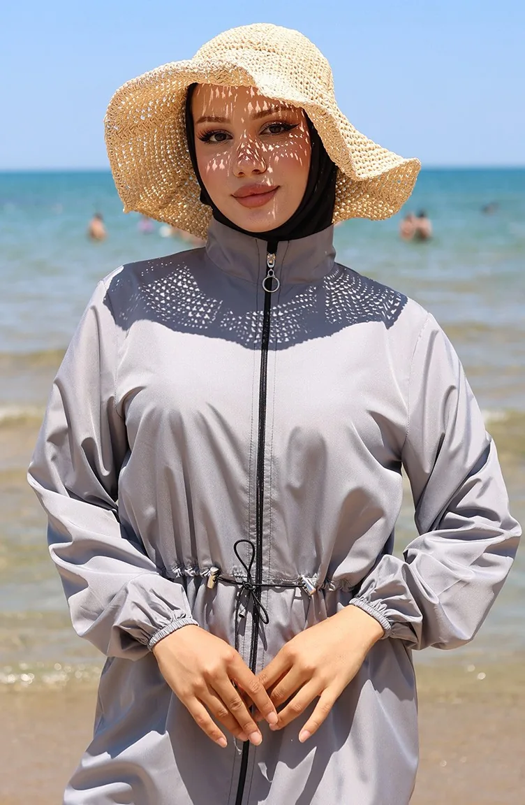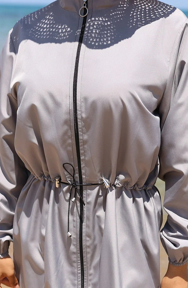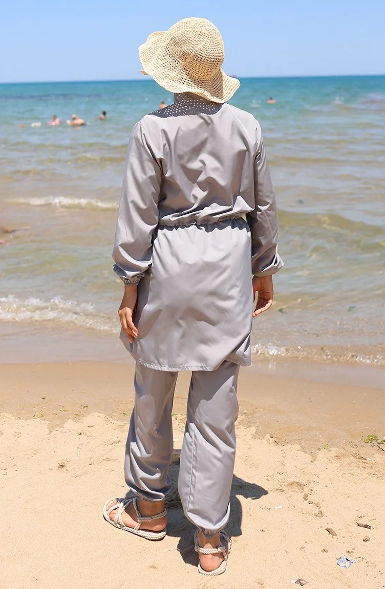 Sahil Beli Lastikli Fermuarlı Tesettür Mayo Çanta Hediyeli 9002-01 Gri