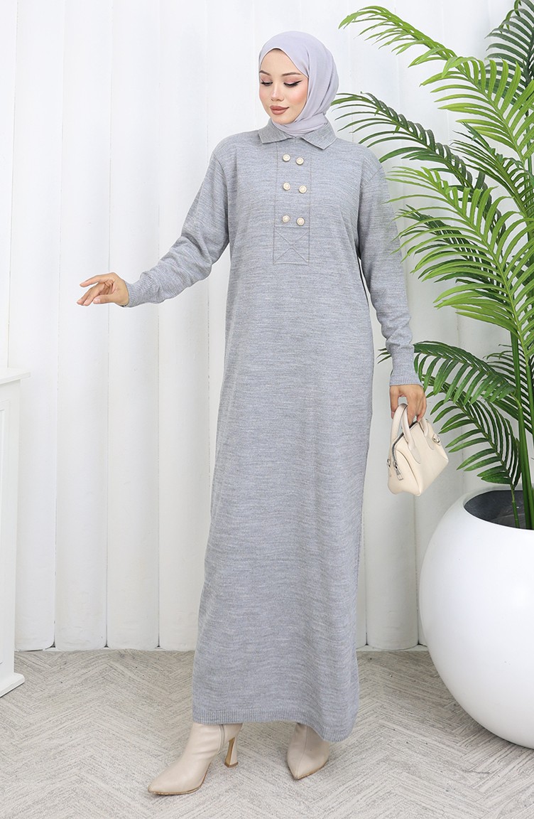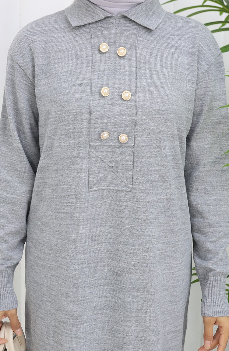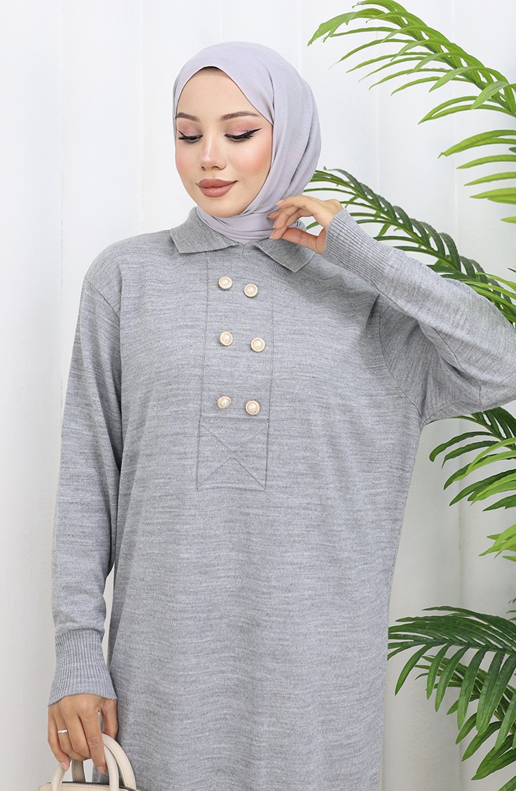 Triko Polo Yaka Düğme Detaylı Elbise 0007-01 Gri