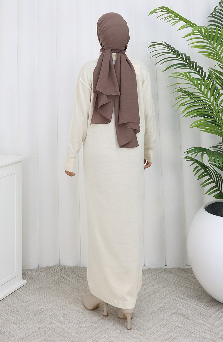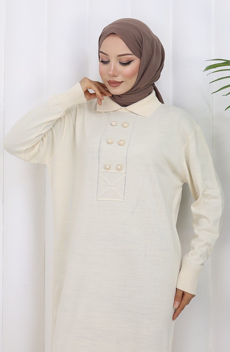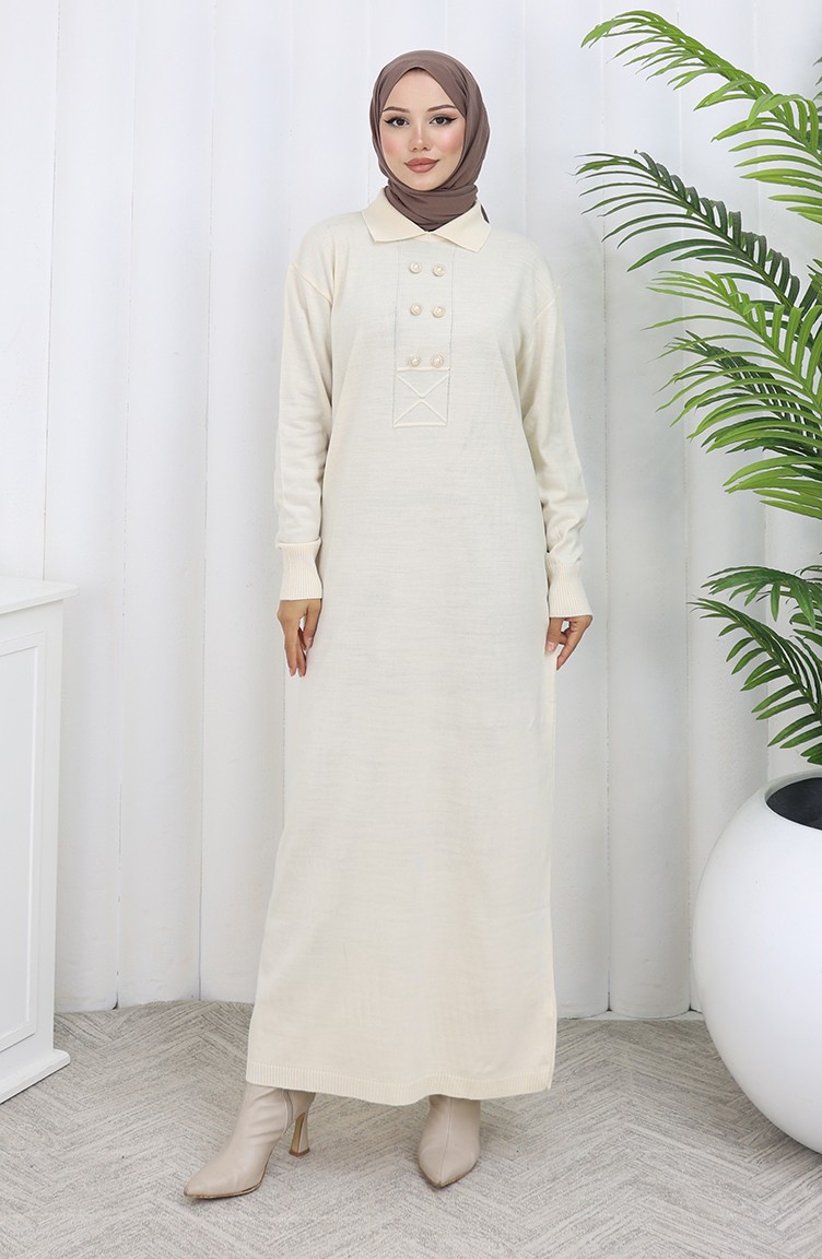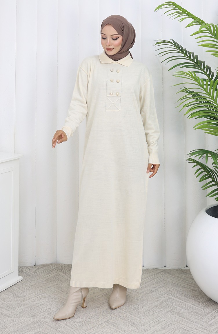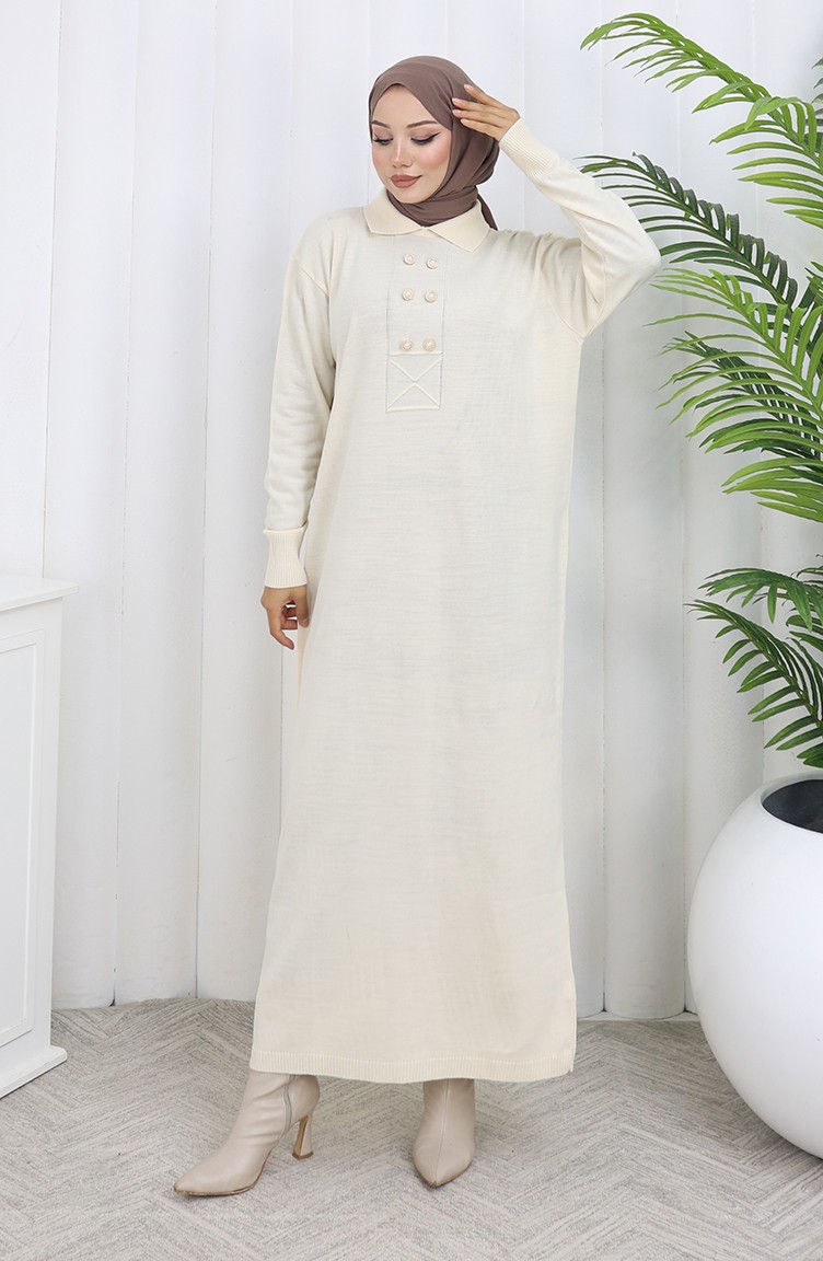 Triko Polo Yaka Düğme Detaylı Elbise 0007-05 Bej