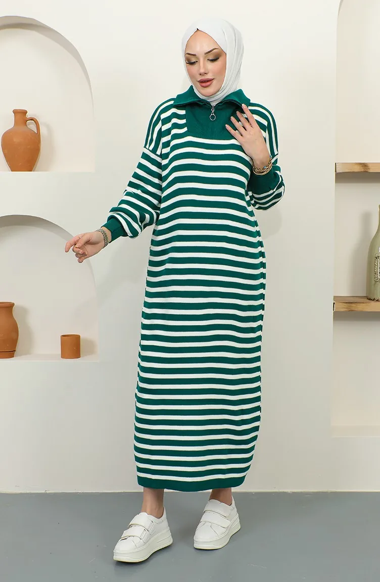 Yaka Fermuarlı Çizgili Triko Elbise 11027-02 Zümrüt Yeşili