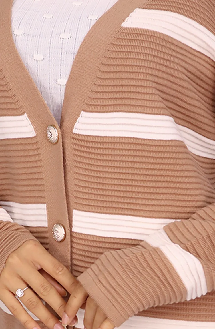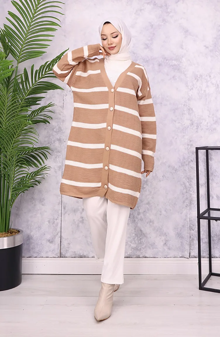 Fitilli Çizgili Triko Hırka 3090-01 Vizon
