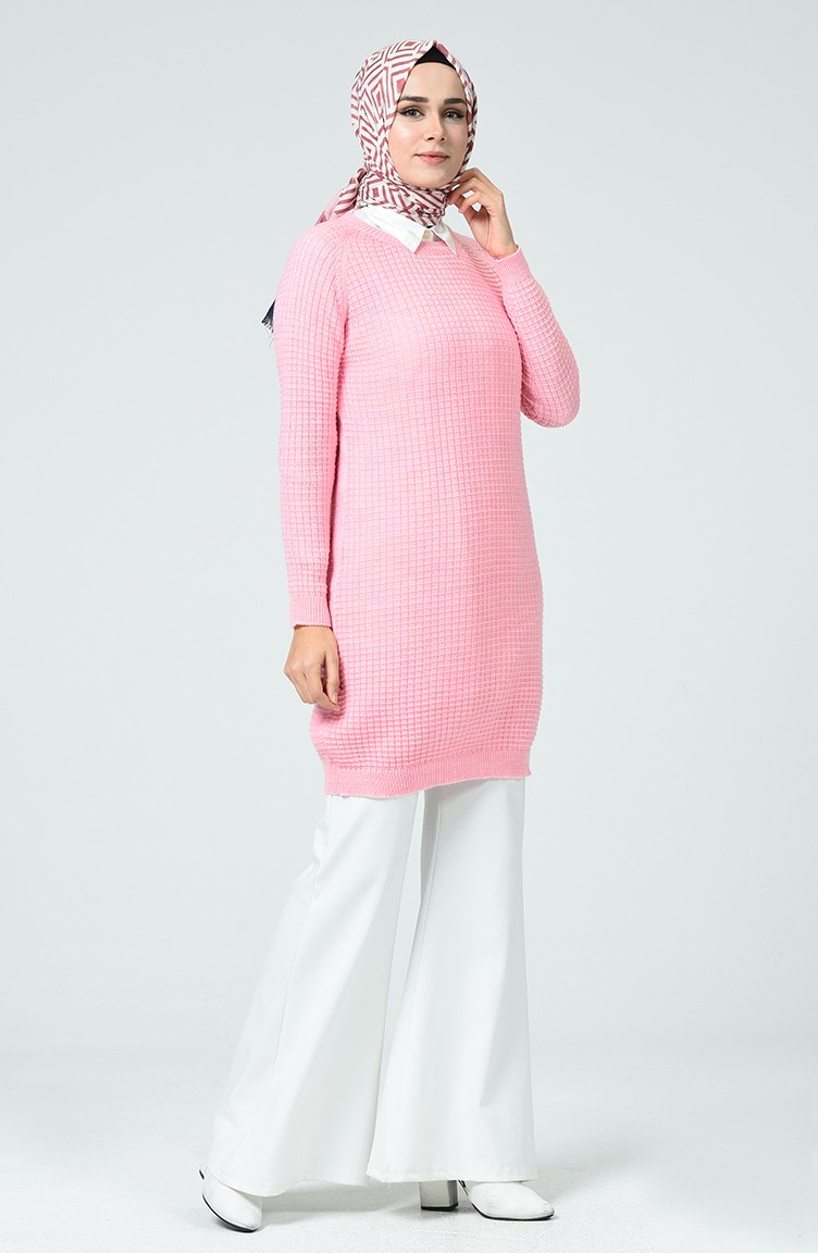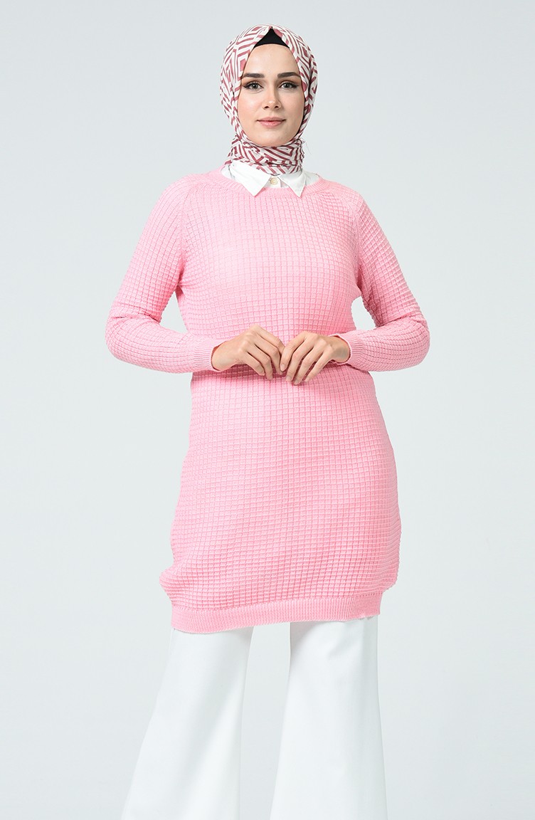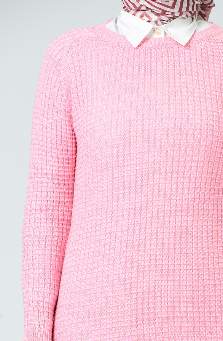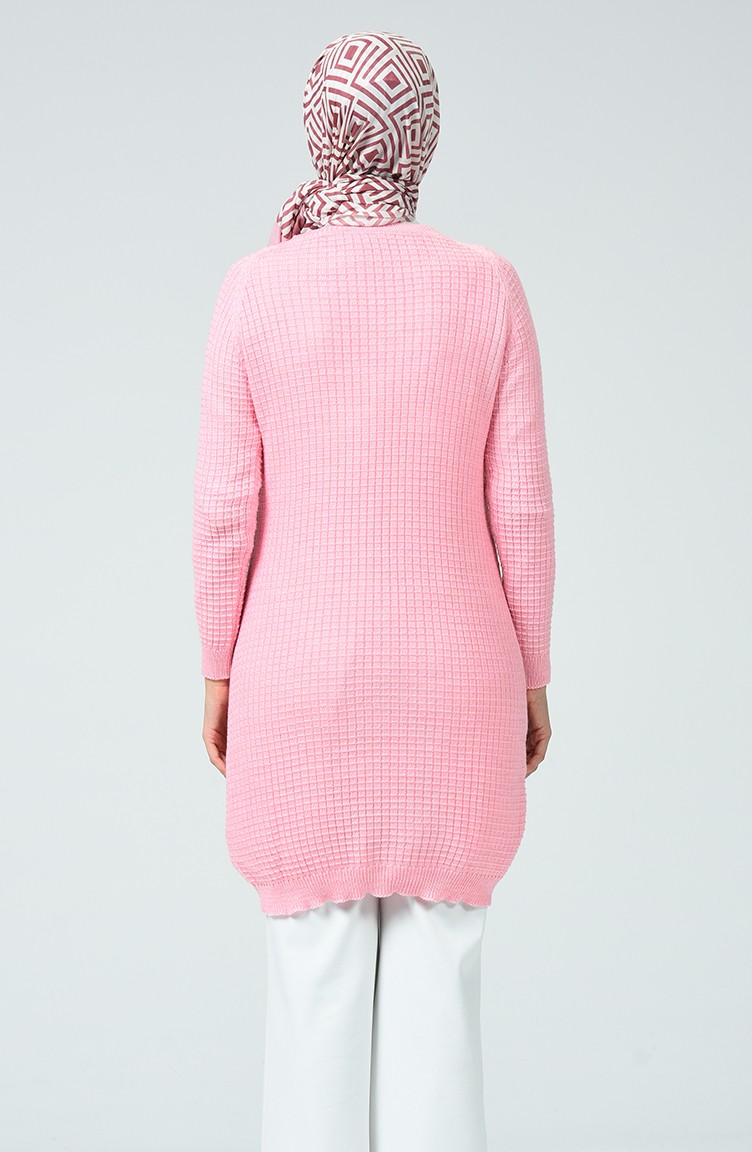 Şeker Pembe renktedir. Triko. Sade. Astarsız. Uzun kolludur. Sıfır yaka detayı ile rahat kullanıma sahiptir. Kışlık. Standart.