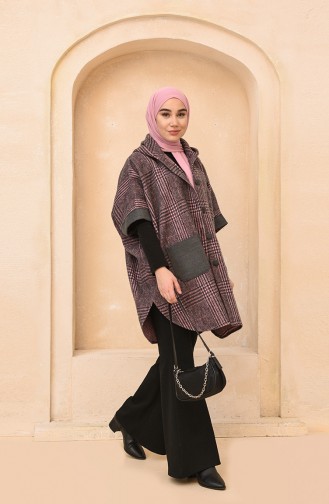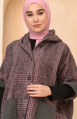 Kapüşonlu Ekose Desenli Panço 4010B-02 Gül Kurusu