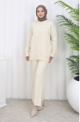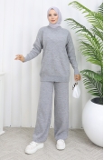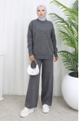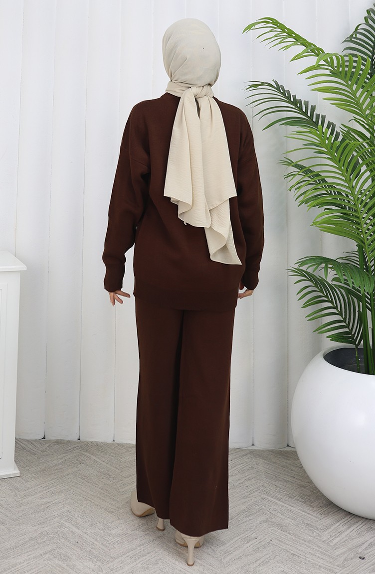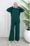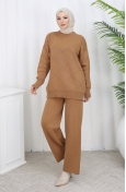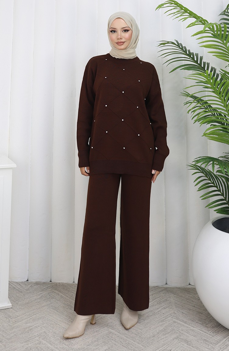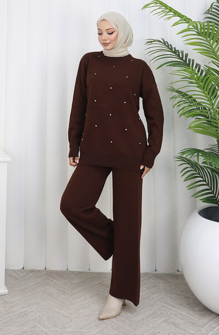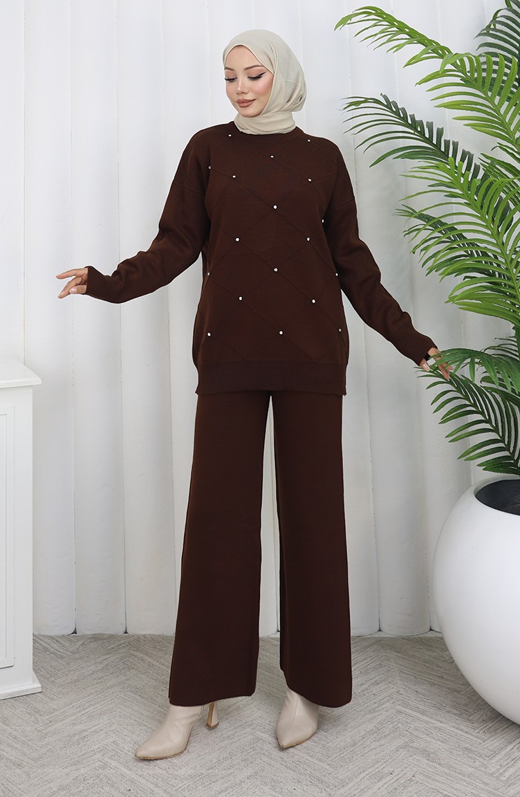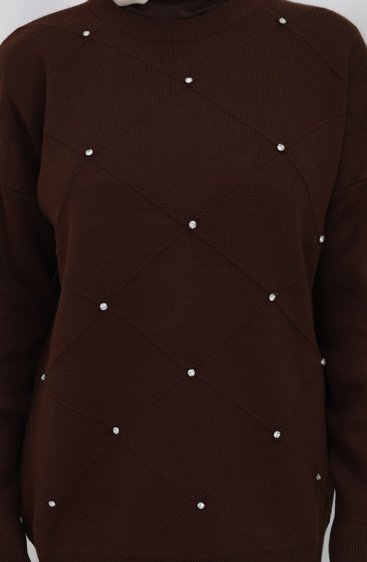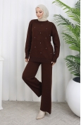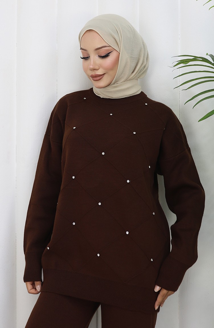 Triko Baklava Desenli Taşlı Kazak Pantolon İkili Takım 0018-04 Kahverengi