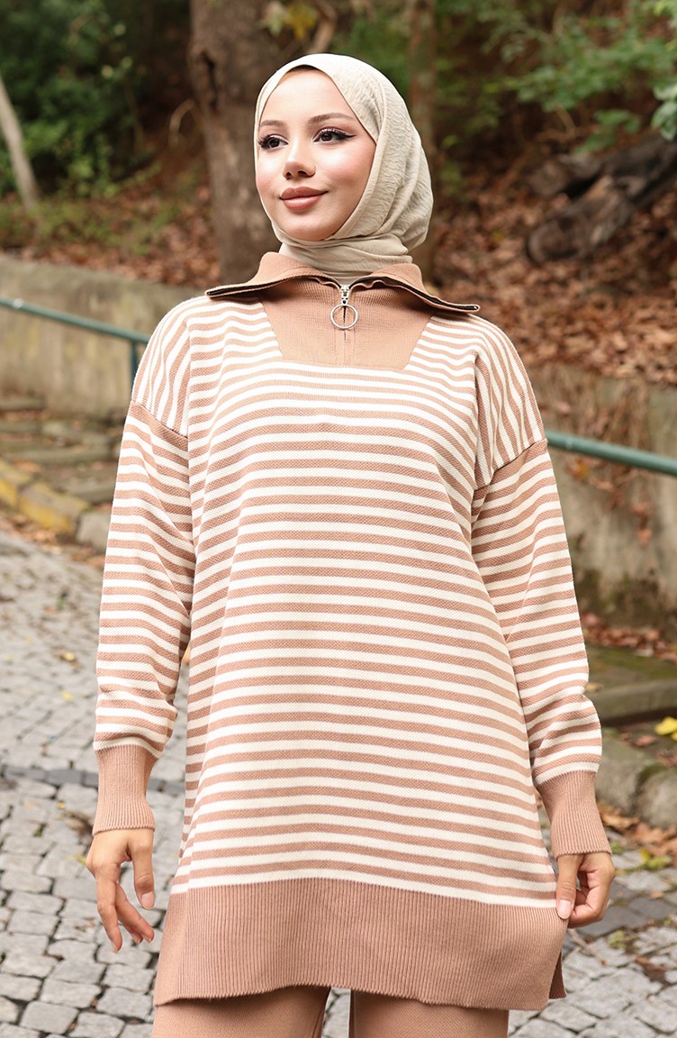Triko Balıkçı Yaka Çizgili Tunik Pantolon İkili Takım 1098-05 Sütlü kahve