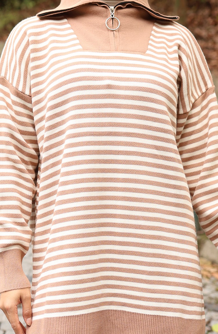 Sütlü Kahve renktedir. Akrilik kumaş. Çizgilidir. Tunik. Balıkçı yaka detayı ile kullanışlı modeldir. Kışlık. 36-42 Beden aralığındadır.