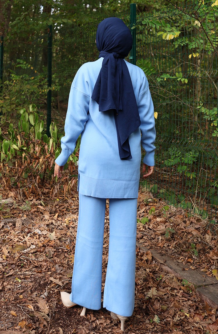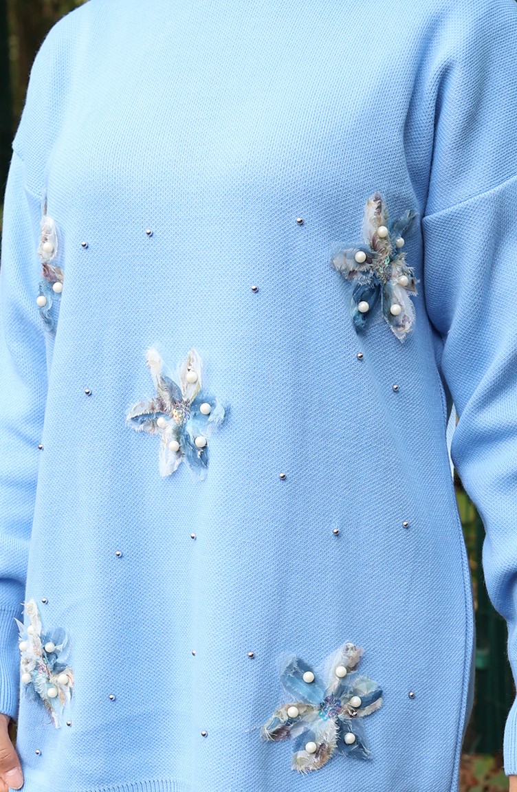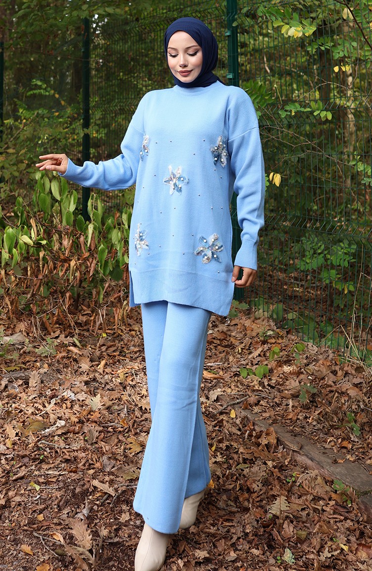 Triko Çiçek Detaylı Tunik Pantolon İkili Takım 1006-03 Mavi