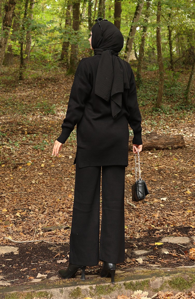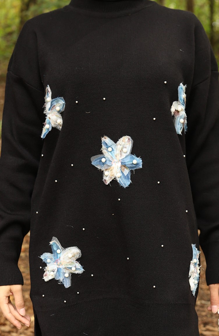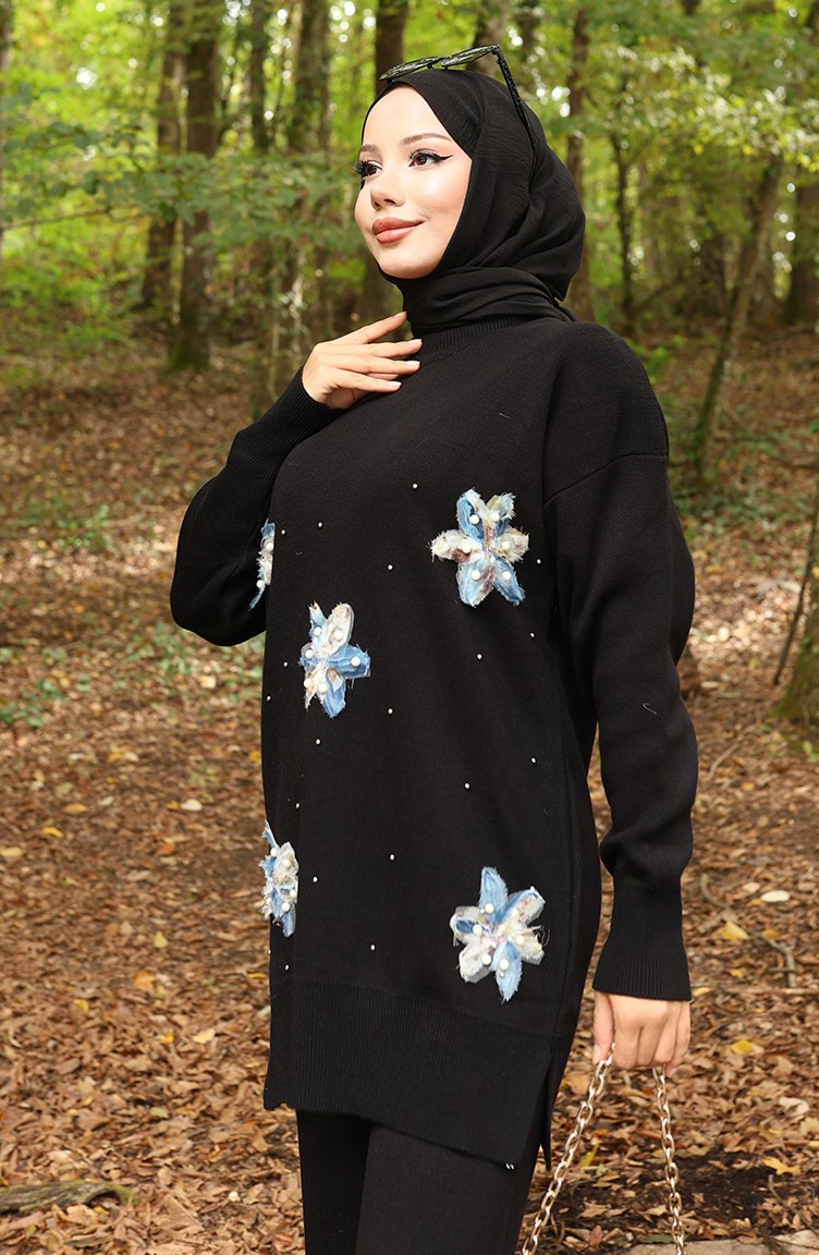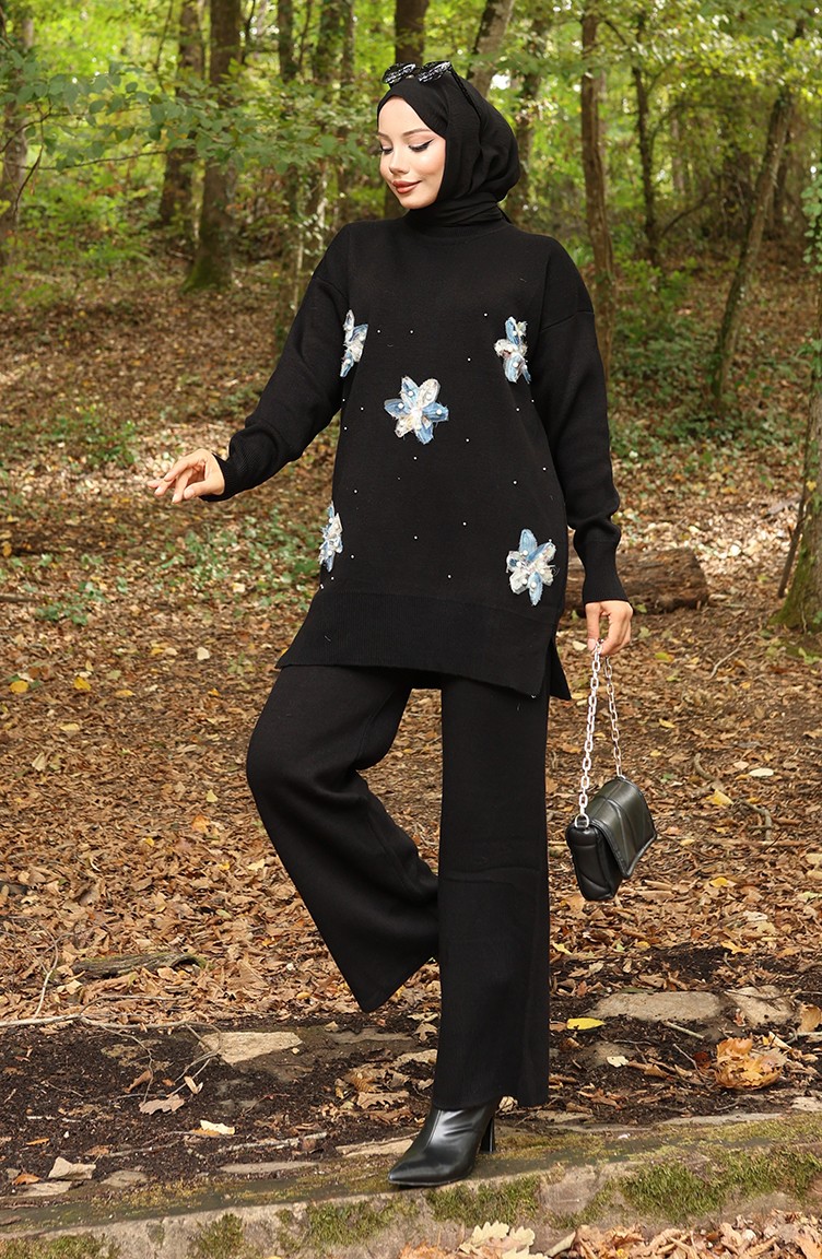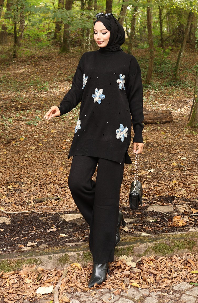 Triko Çiçek Detaylı Tunik Pantolon İkili Takım 1006-09 Siyah