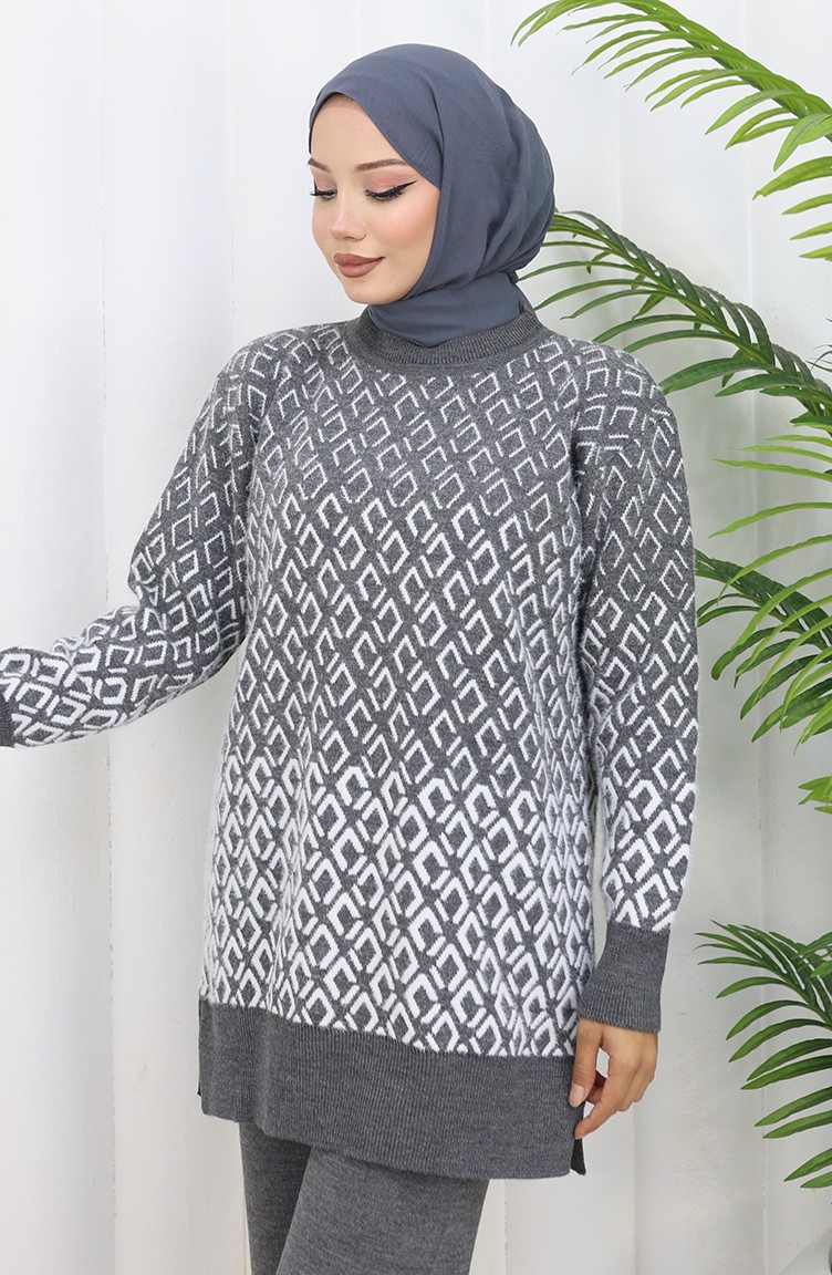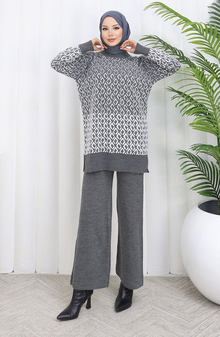 Triko Desenli Tunik Pantolon İkili Takım 1085-02 Gri