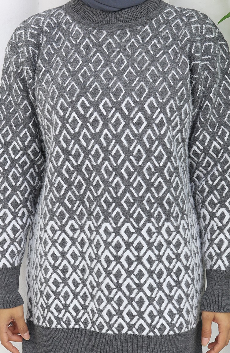 Gri renktedir. Akrilik kumaş. Desenli kumaş. Tunik. Kışlık. 36-42 Beden aralığındadır.