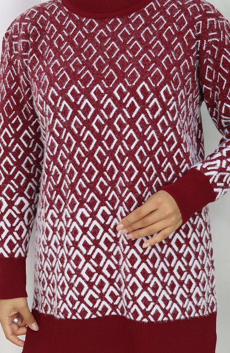 Bordo renktedir. Akrilik kumaş. Desenli kumaş. Tunik. Kışlık. 36-42 Beden aralığındadır.