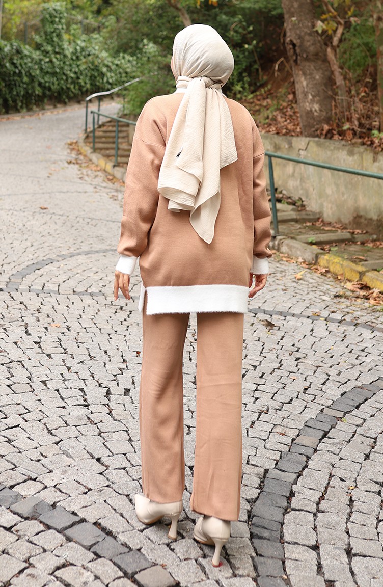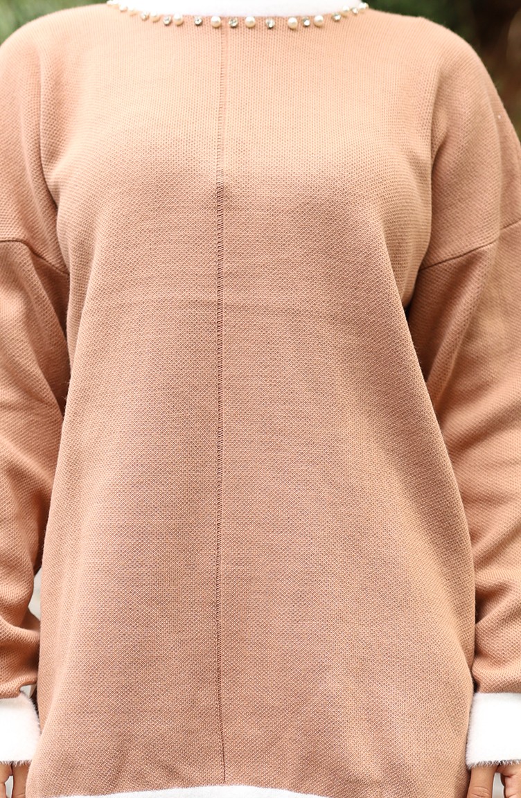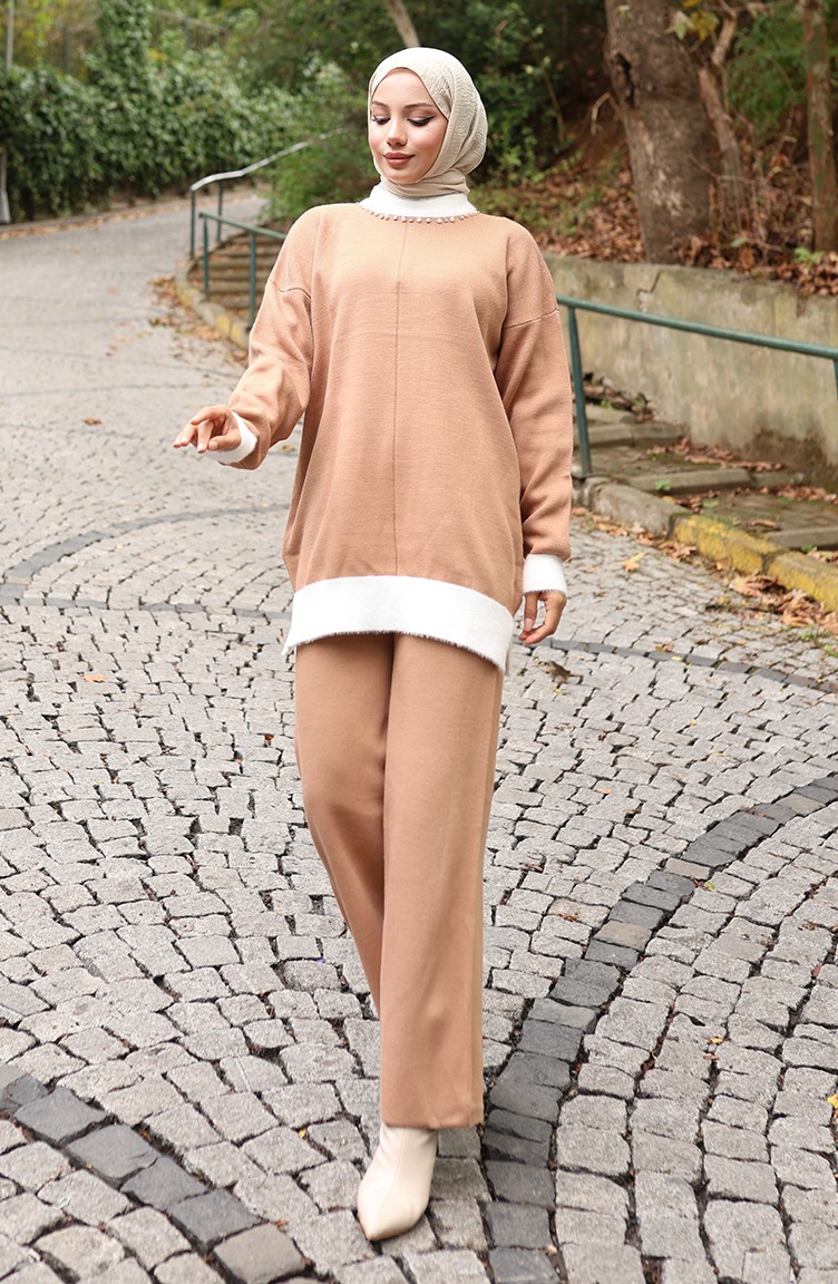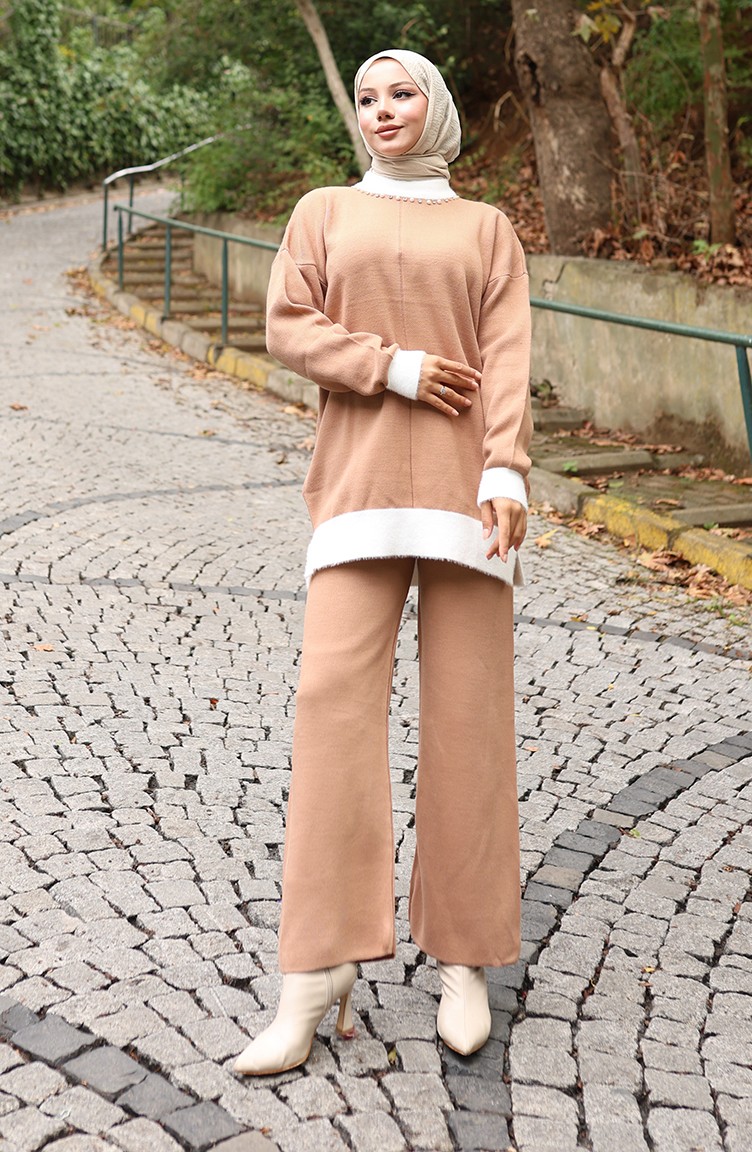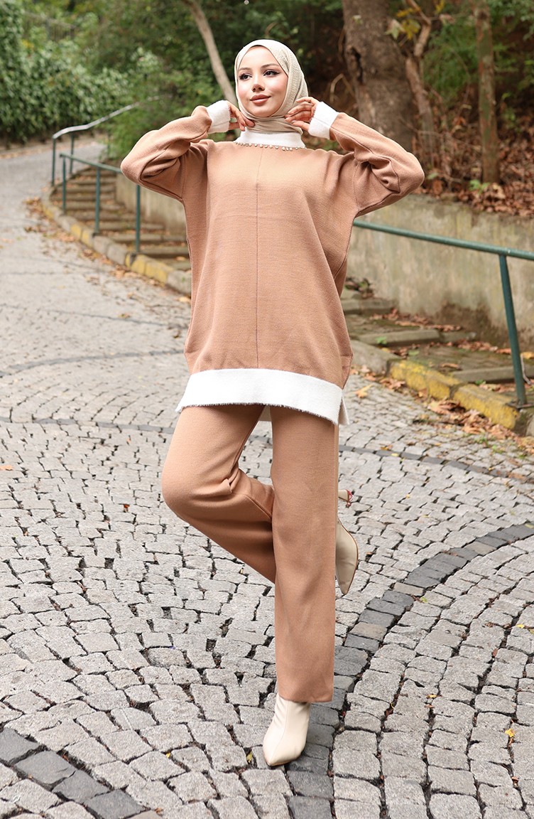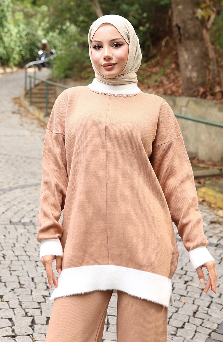 Triko İnci Detaylı Tunik Pantolon İkili Takım 1011-02 Sütlü kahve