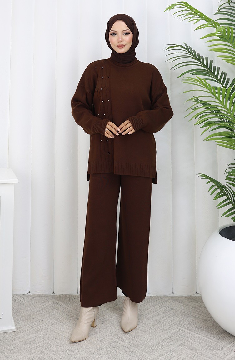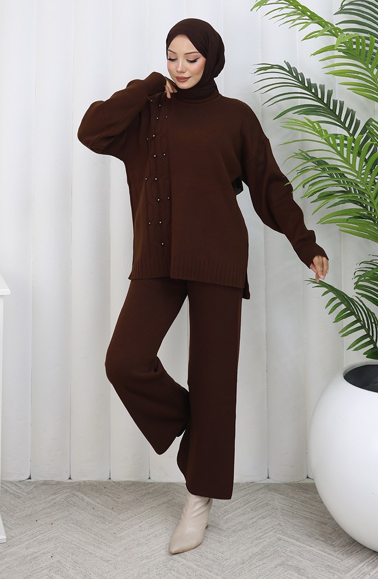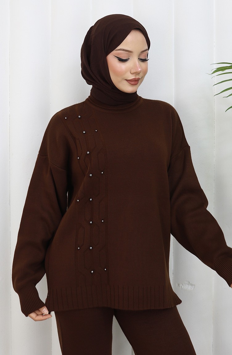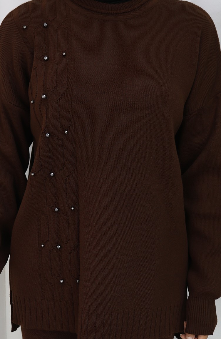 Triko Taş Detaylı Kazak Pantolon İkili Takım 0014-04 Kahverengi