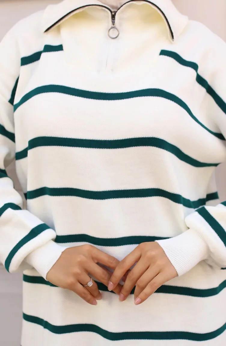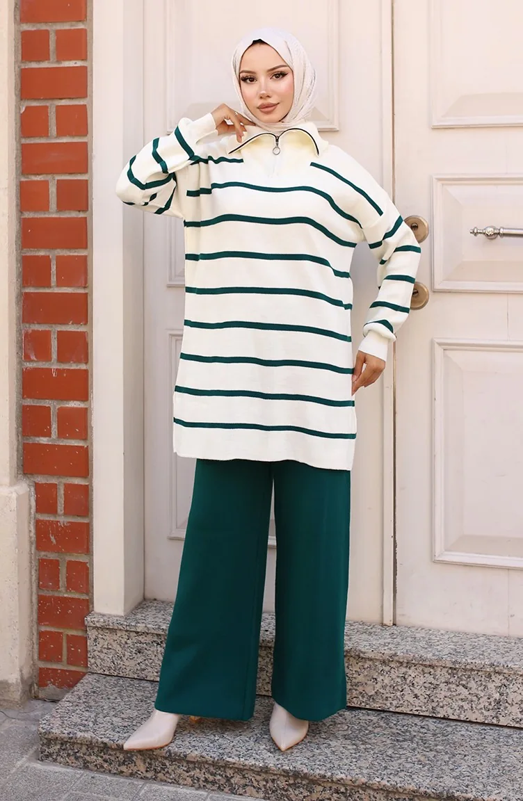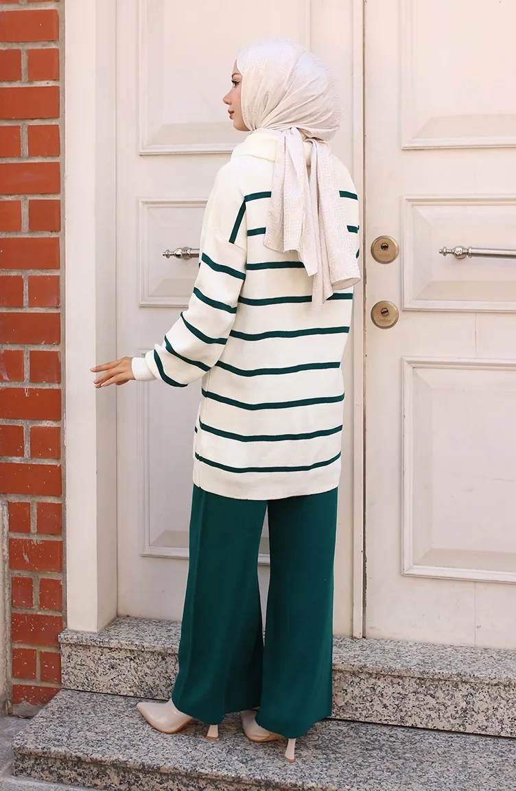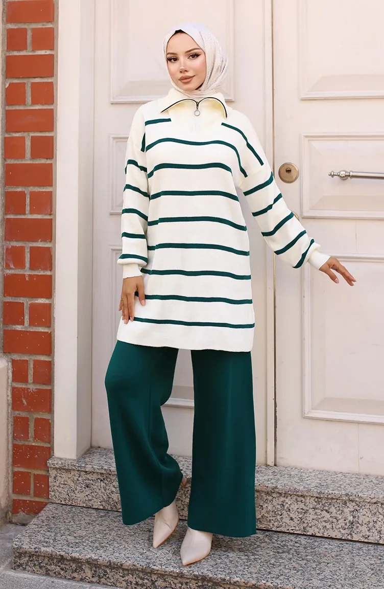 Yakası Fermuarlı Çizgili Triko Takım 11034-01 Zümrüt Yeşili