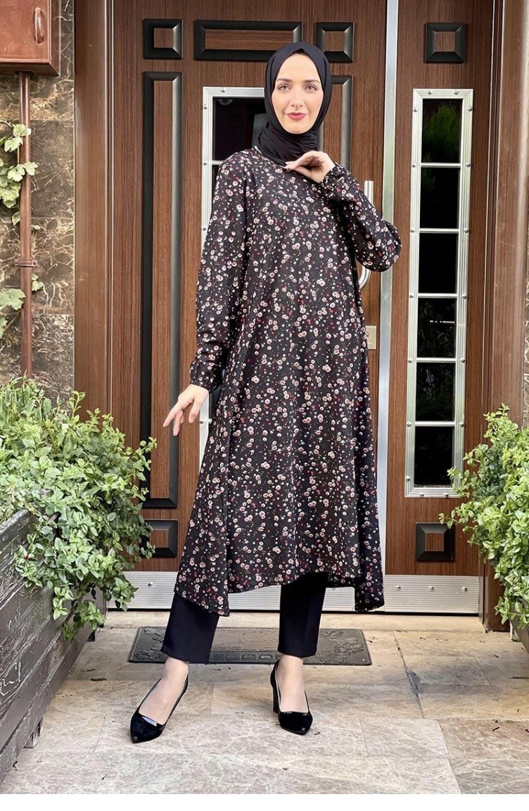 1813Cvn Çiçek Desenli Tesettür Tunik Siyah