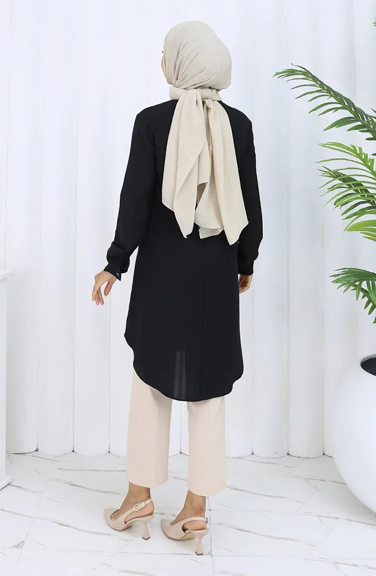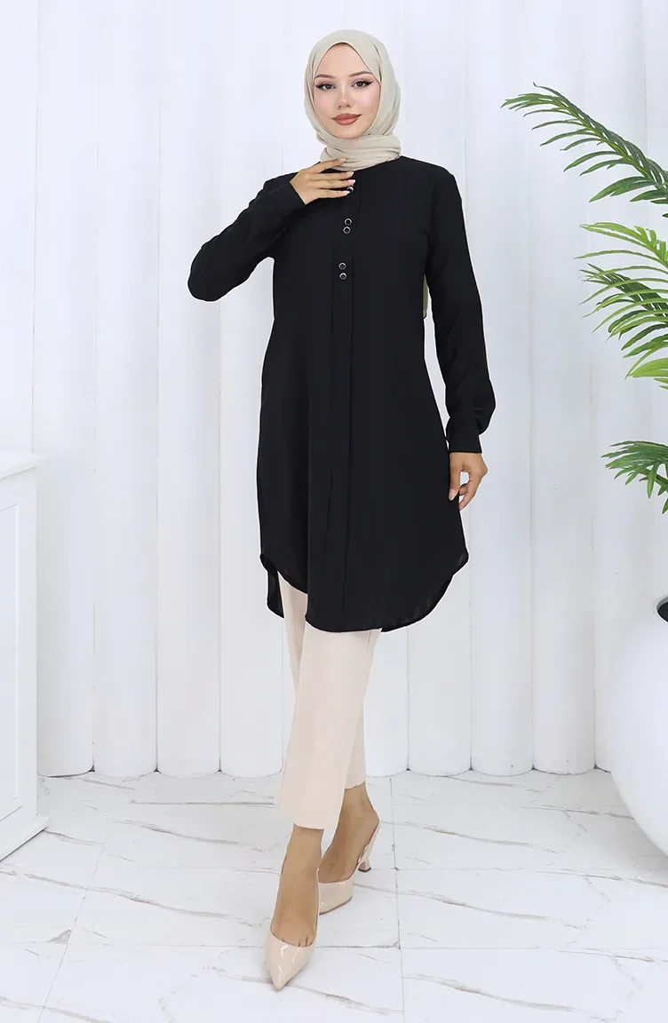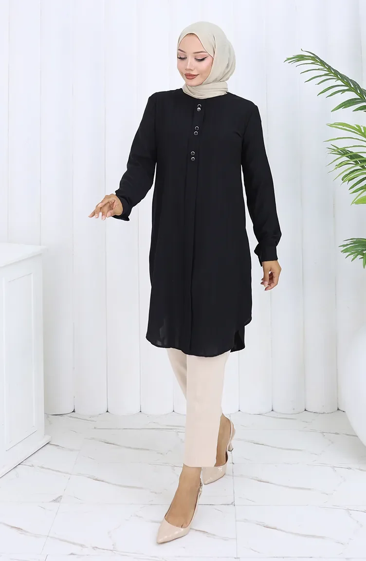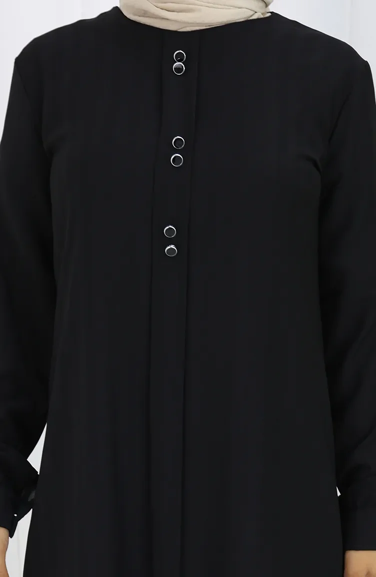 Siyah renktedir. Krep kumaş. Sade. Düğmeli. Sıfır yaka detayı ile rahat kullanıma sahiptir. 4 Mevsim tercih edebilirsiniz. Büyük beden seçeneği mevcuttur.