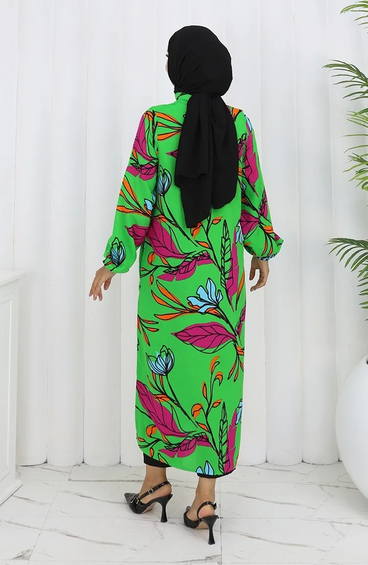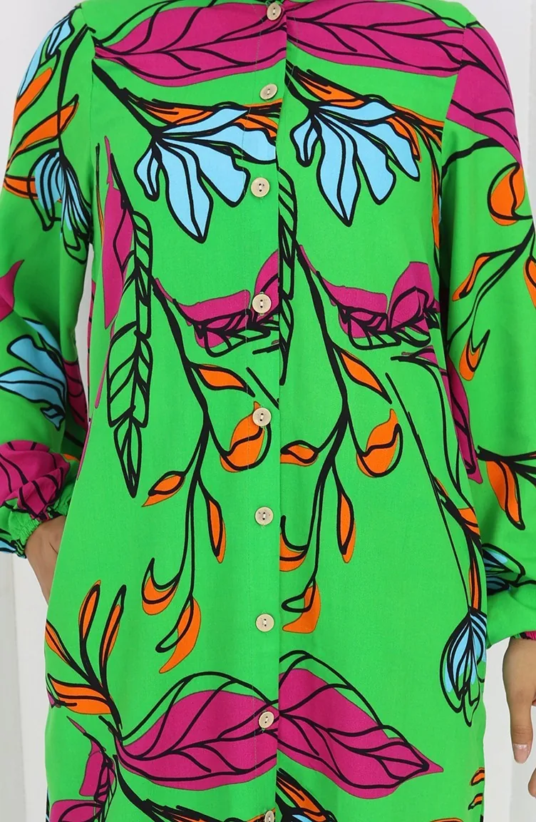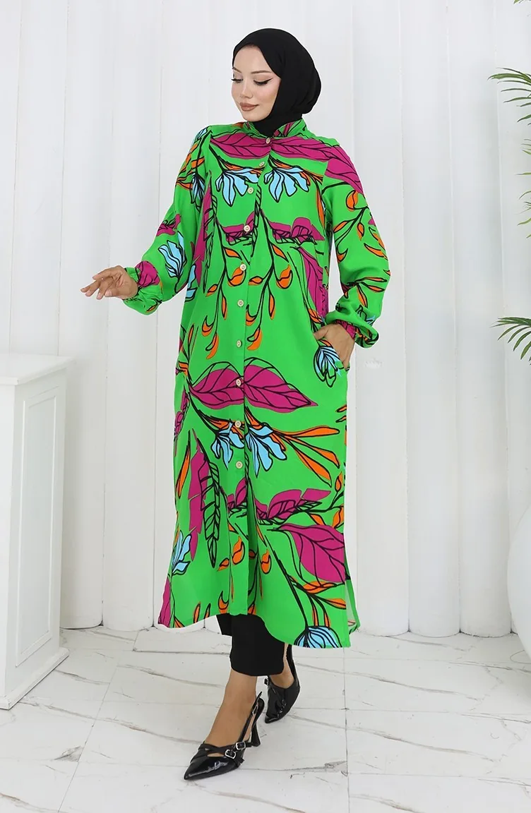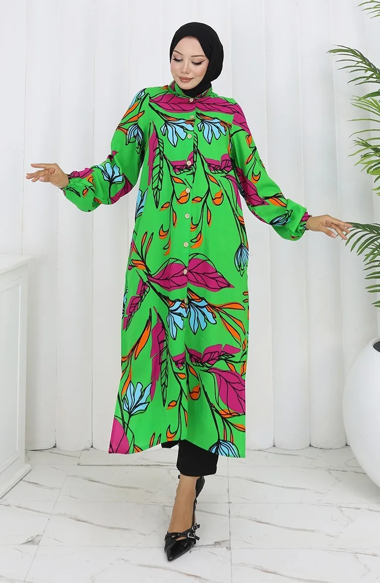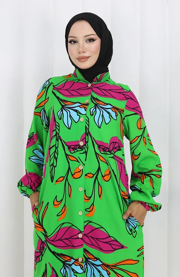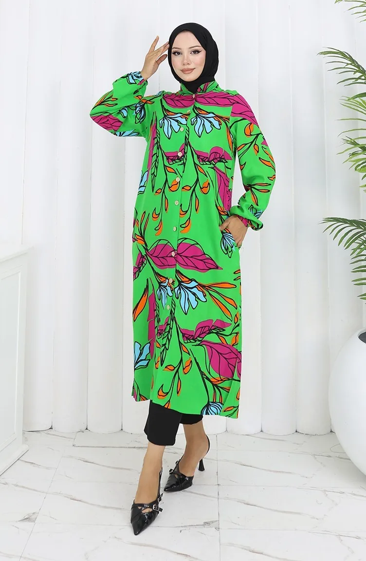 Yeşil renktedir. Viskon kumaş. Desenli kumaş. Düğmeli. Lastik kollu. Hakim yaka detayı ile kullanışlı modeldir. 4 Mevsim tercih edebilirsiniz. Standart.