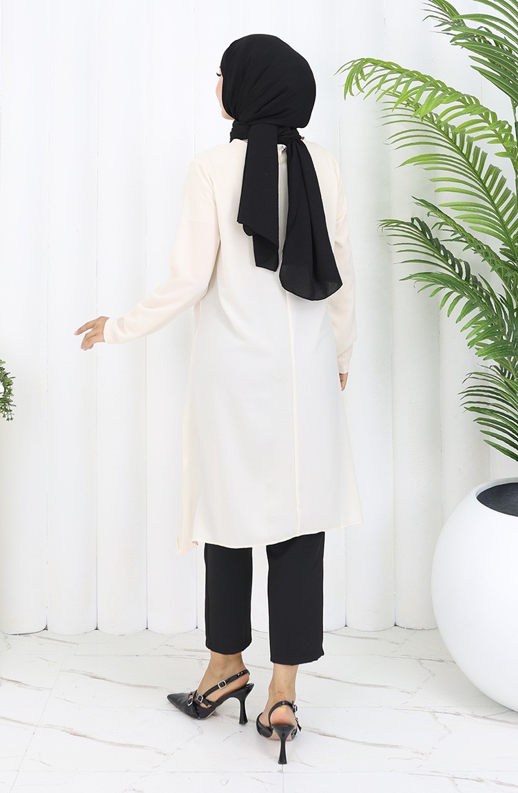 Bej renktedir. Polyester kumaş. Sade. Düğmeli. Sıfır yaka detayı ile rahat kullanıma sahiptir. Yazlık. Büyük beden seçeneği mevcuttur.