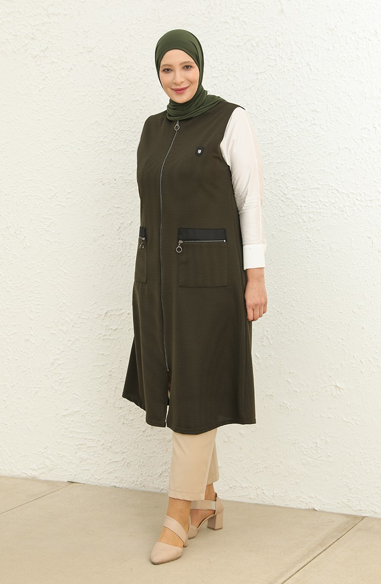 Kadın Büyük Beden Deri Cepli Çelik Yelek 8429 Haki